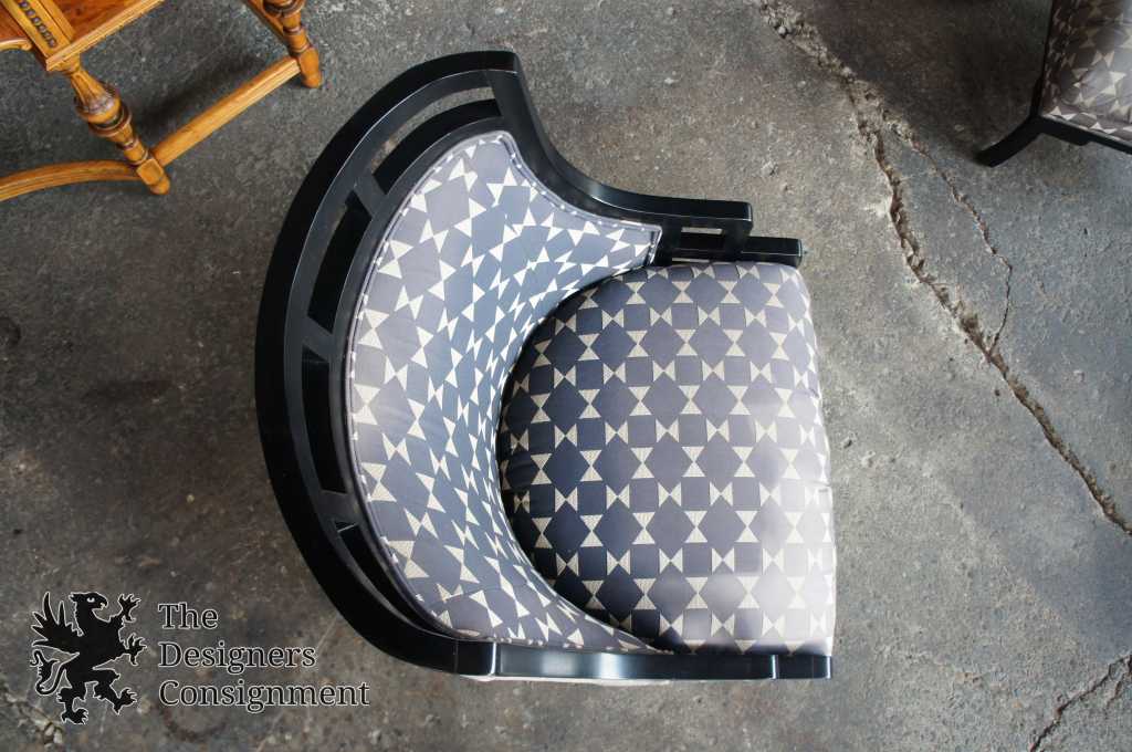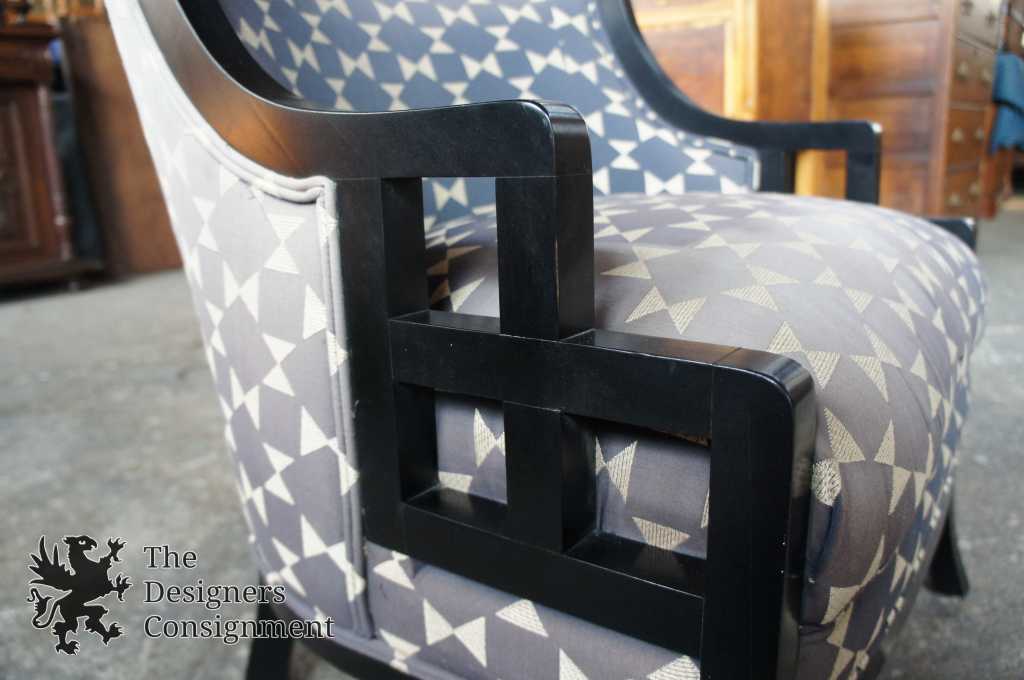 Century Chair Company James Mont inspired club chair with ottoman. Modern styling with a sleek black finish and geometric fabric.