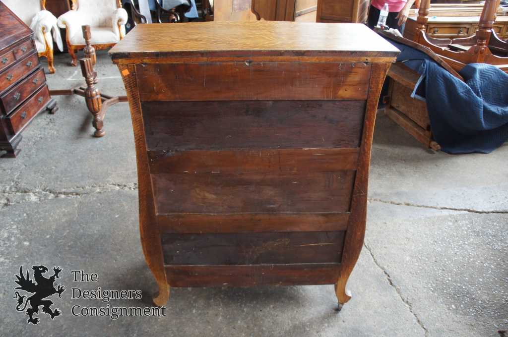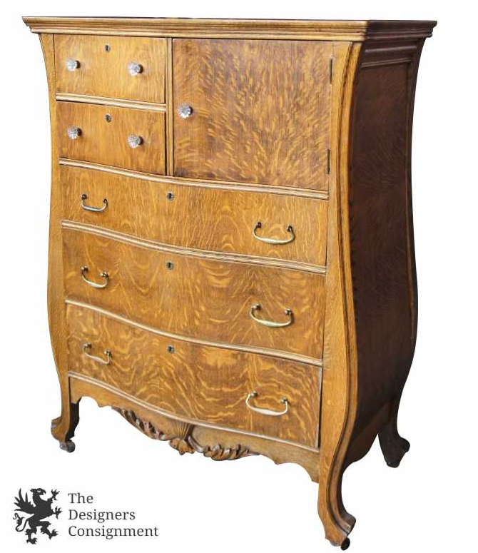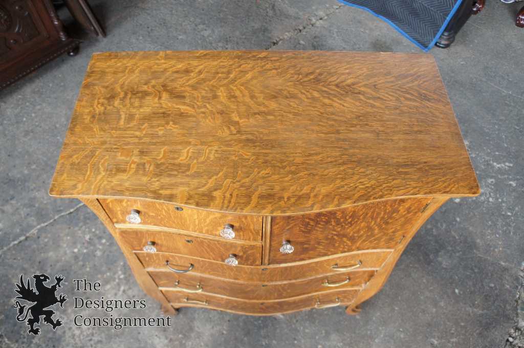 An early 20th century quartersawn oak chest. Serpentine front with carved accents. Features 6 drawers with glass/brass hardware and a compartment along the right for storage of larger items. Pad feet with original casters.