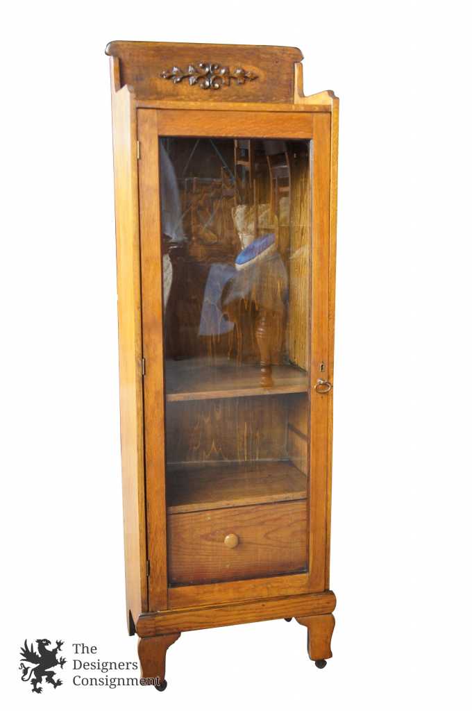 A beautifully designed petite oak bookcase. Made by J L Gillman, circa early 20th century. Features a glass front with handle and lock. Inside there is a lower pine cabinet door and fixed shelf. Peg holes are available along the side for additional shelving. The cabinet has a fixed upper back-splash with classic Victorian acanthus carving. On casters for ease of movement. This piece could be used for display, storage, or even as a gun cabinet if hardware was added.