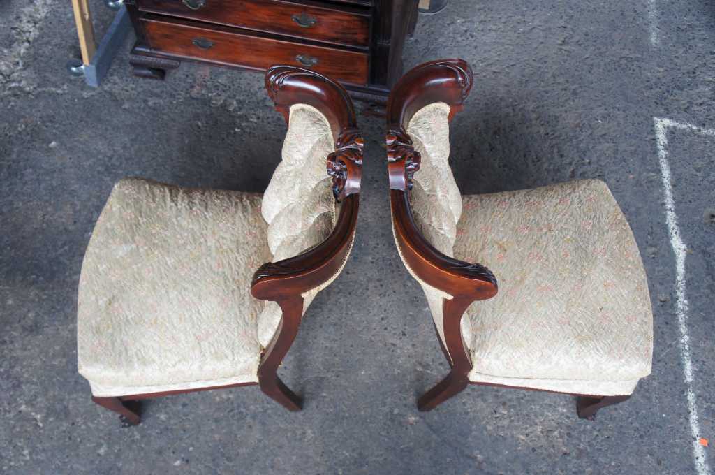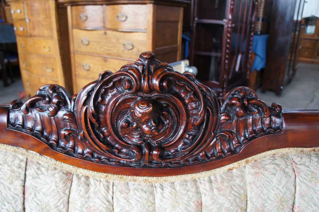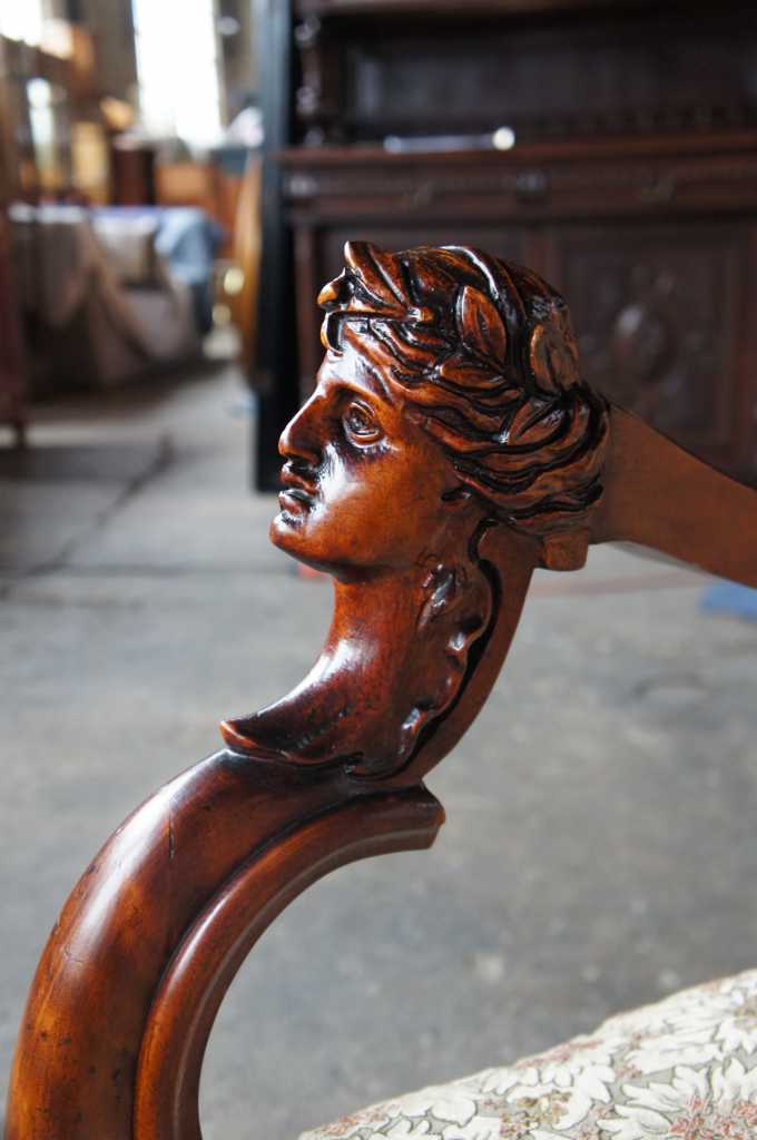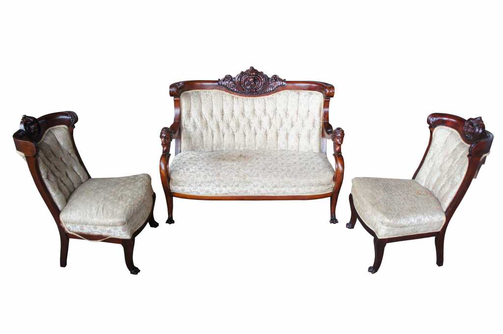 Featured is a 3 piece figural parlor set. Made from Mahogany with baroque inspiration. Includes high relief carvings showing cherubs along the backs amongst ornately scalloped detail. Along the arms of the settee the face of a young Greek woman is shown. Front legs extend to paw feet. Upholstery is a thick floral design with a tufted back. A gorgeous set that will add grandeur to any setting.