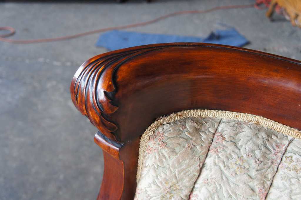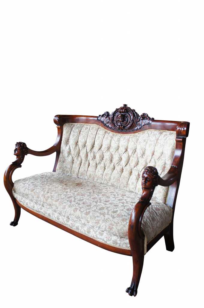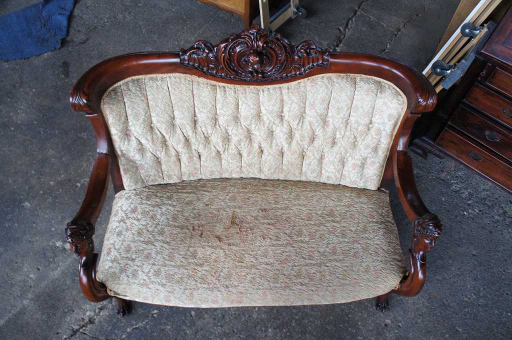The wood is in great overall condition. Some distressing Fabric has staining, wear and loose cording. See Pictures for best description