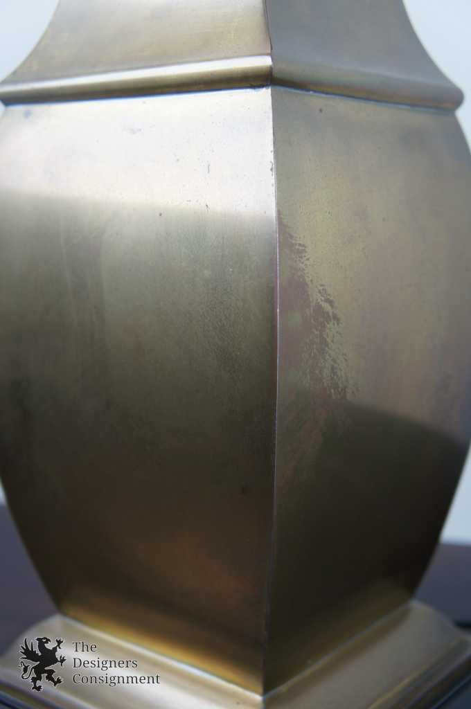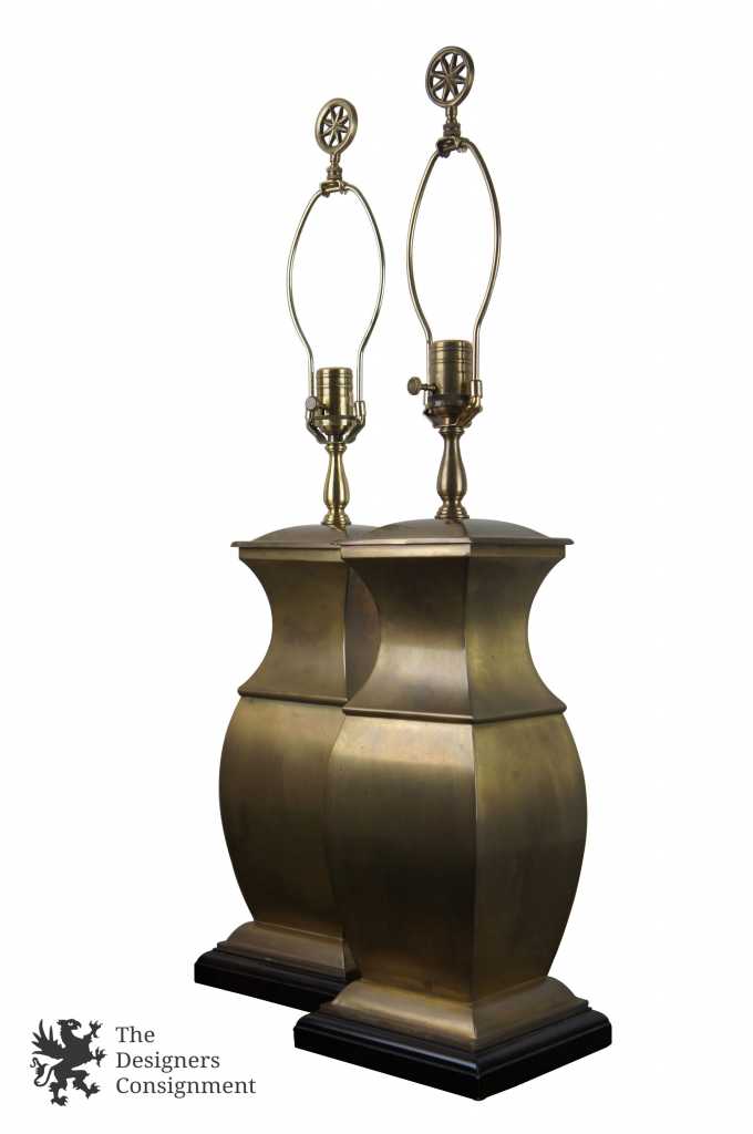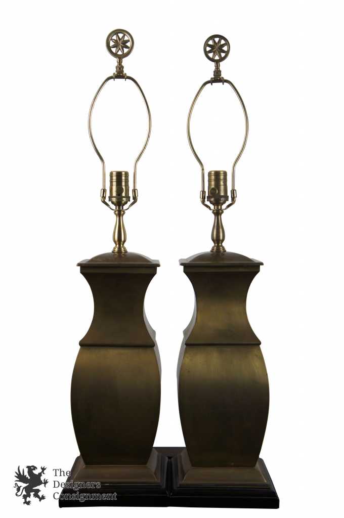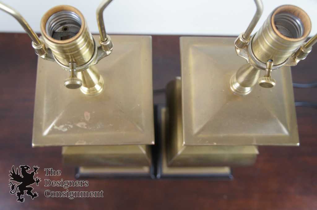 A beautiful pair of Wildwood table lamps. Made from brass with a brushed finish and pinwheel finial.
