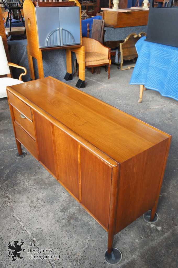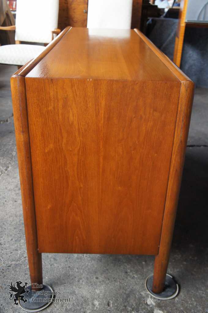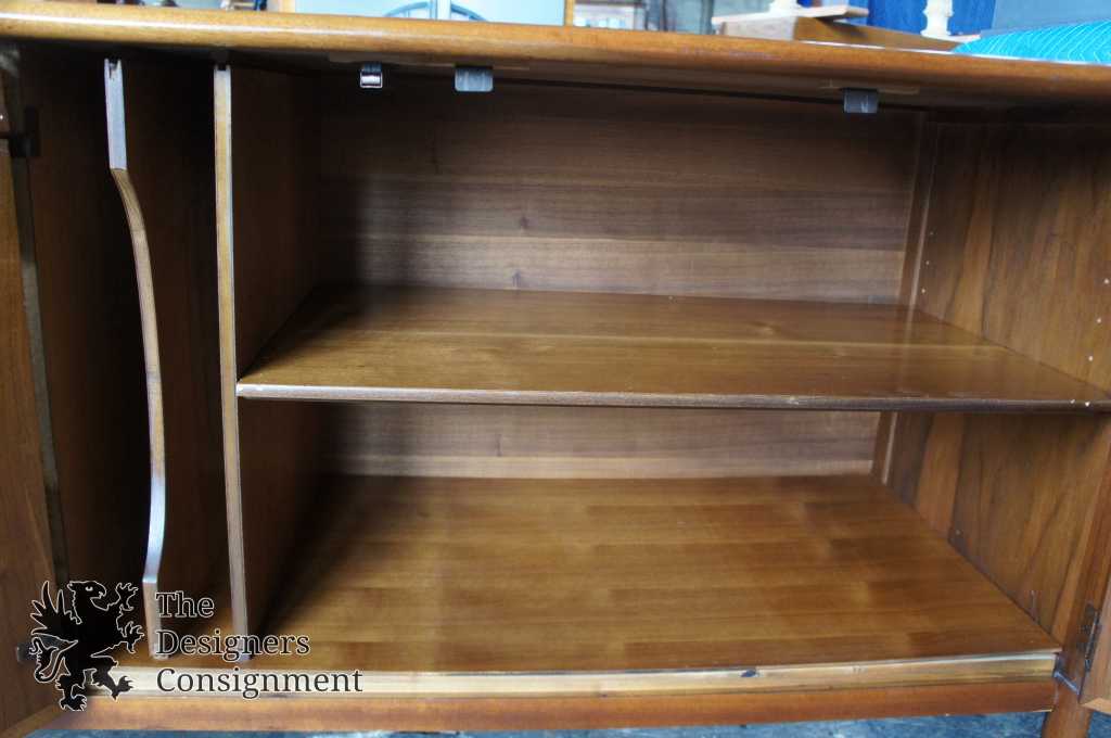 Solid walnut credenza by Drexel. Circa 1950-60s. Part of the Parallel collection that was designed by Barney Flagg. A sleek design with 3 dovetailed drawers. Right side cabinet opens to horizontal and vertical storage. Perfect for records and other audio equipment. A great piece for any setting.