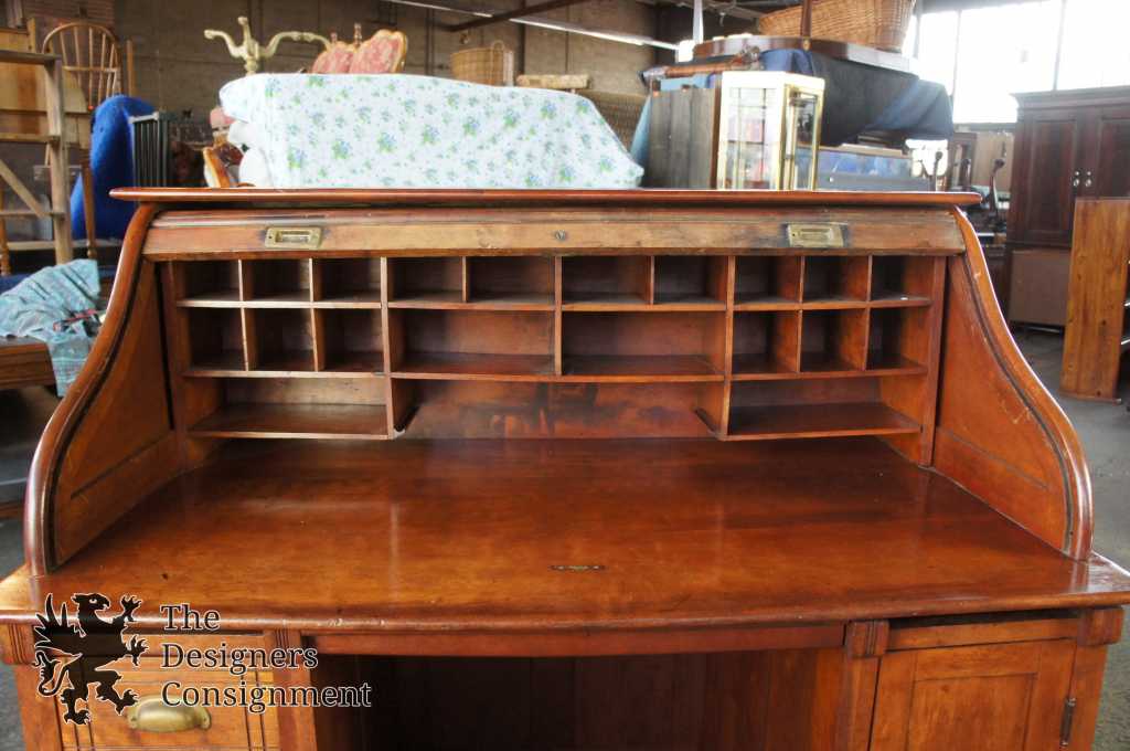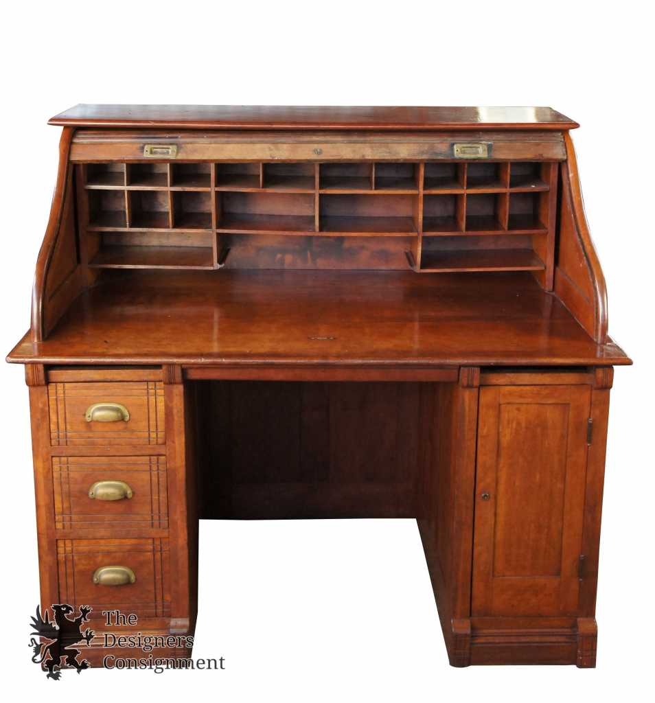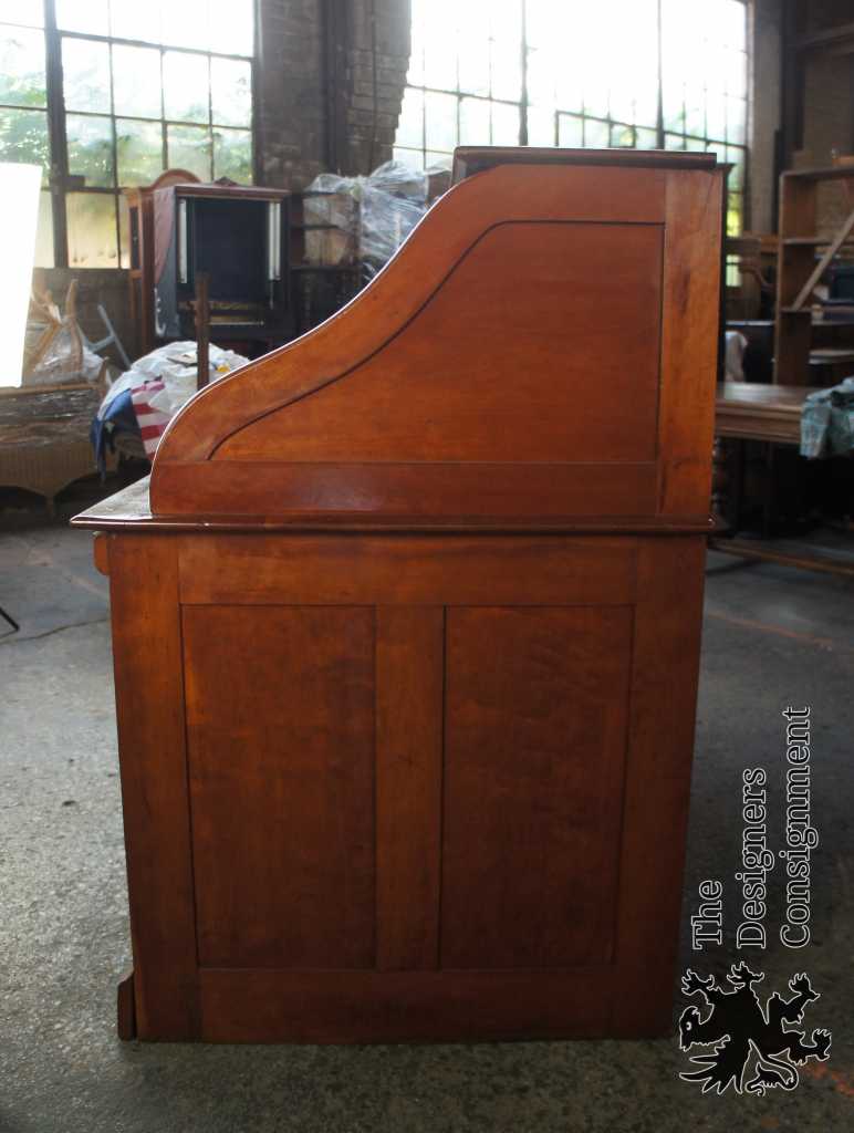 Late 19th Century Victorian Desk. A beautifully designed S curve roll top with tambour door. Opens to several pigeon holes. Lower portion has three drawers along the left and a divided cabinet to the right. A great fit for any office.
