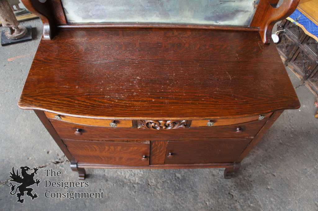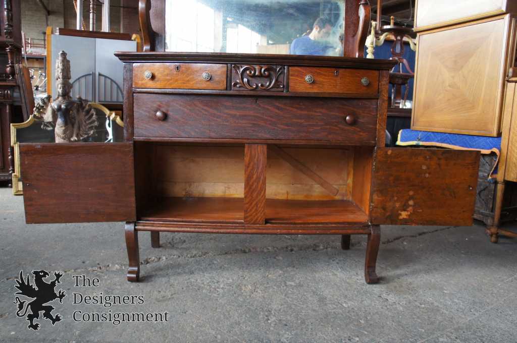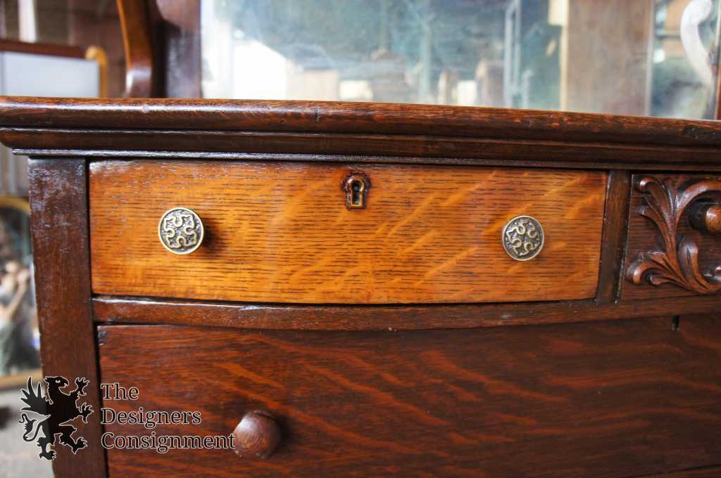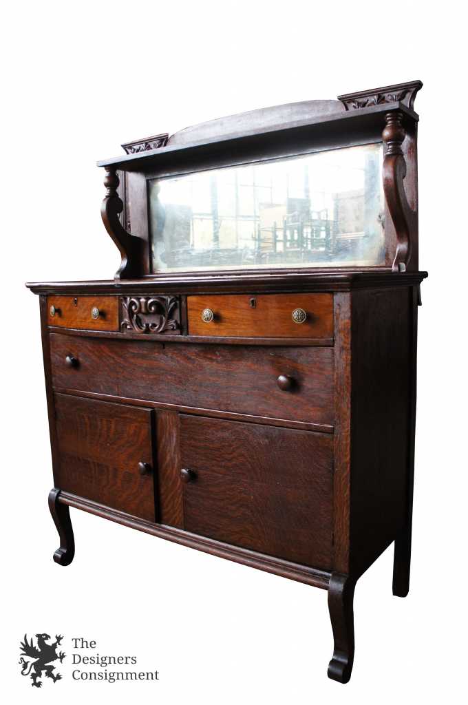 Early 20th century buffet with mirror. Quartersawn oak with carved accents. Two-tone front with bow-front. Includes 3 dovetailed drawers and lower cabinet portion. Great for serving, or bottle display.