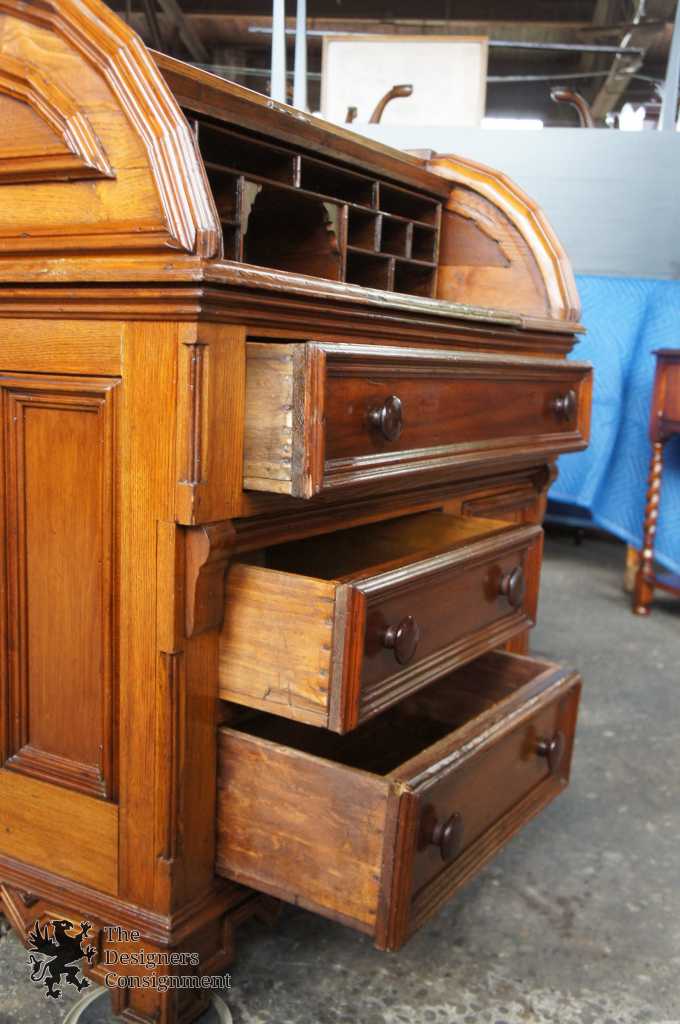 Up for consideration is an early 20th century oak secretary desk. Half cylinder design with protruding panels and a zigzag trim. Some what of a brutalist blueprint. The desk opens to a pullout surface and pigeonholes for organization of letters and other documents. Lower side shows 3 drawers of nailed construction and side cabinet for storage of larger items. A neat piece that will draw attention in any space.