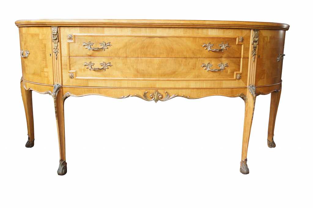 An exquisite French walnut sideboard by Robert Irwin Furniture Company. Elegantly designed with matchbook veneered top and front surfaces. Includes bronze mounts, inlays, and acanthus carvings in addition to locking outer cabinets. Circa 1950.