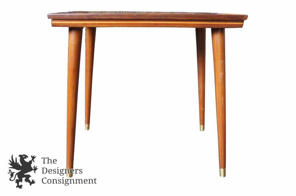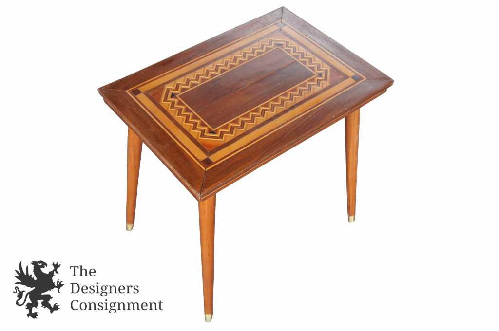 An exceptionally detailed marquetry side table. Made on March 19th, 1934. It took 616 pieces to complete the table and 9 different woods. Including; Walnut, Oak, Maple, Mahogany, Cherry, Wild Cherry. The last 2 woods I cannot make out from the letter along the back. This table was made as an anniversary gift by the father of one of my clients for his parents.
