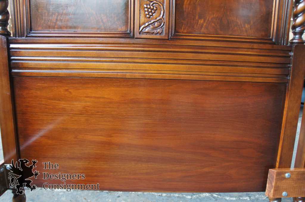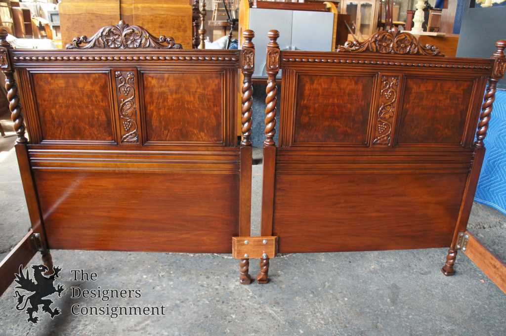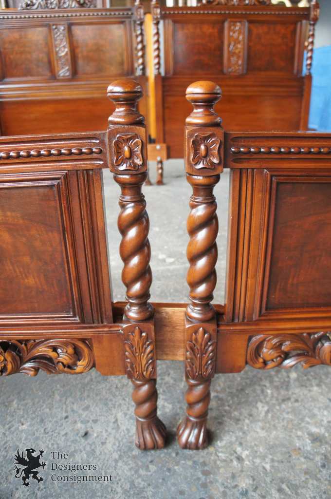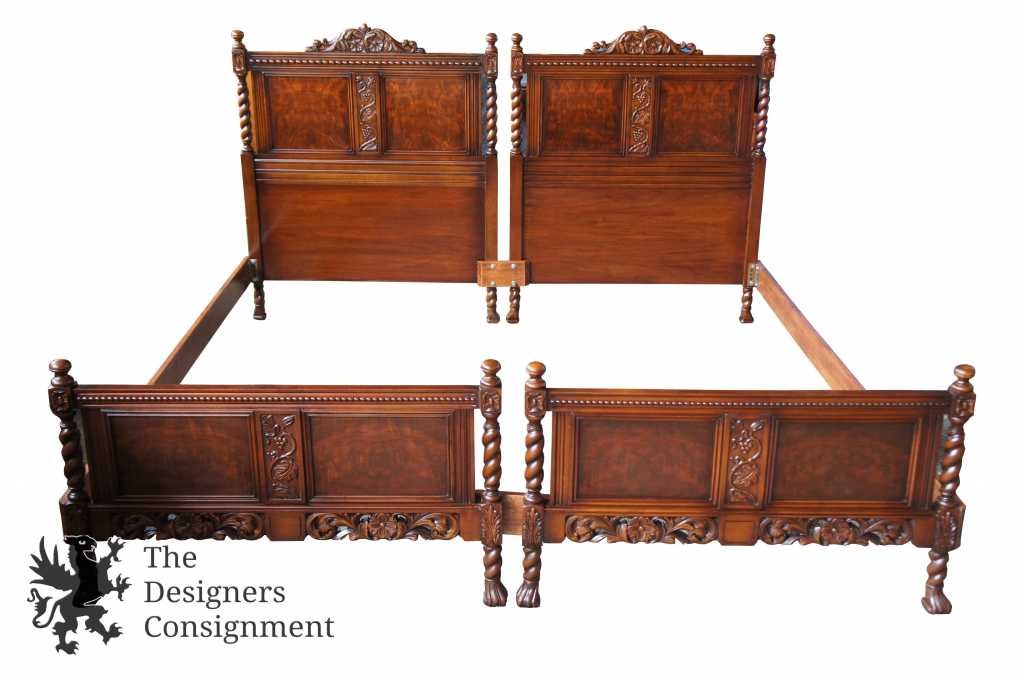 An exquisite crotched walnut bed by Robert W. Irwin Furniture Company. Elegantly designed with matchbook veneered front, barley twist supports, carved accents, and pressed flourishes. Circa 1928-1940. Originally a twin bed set that was modified to be used with a king frame. It can be used as is, or separated for use as twin beds.
