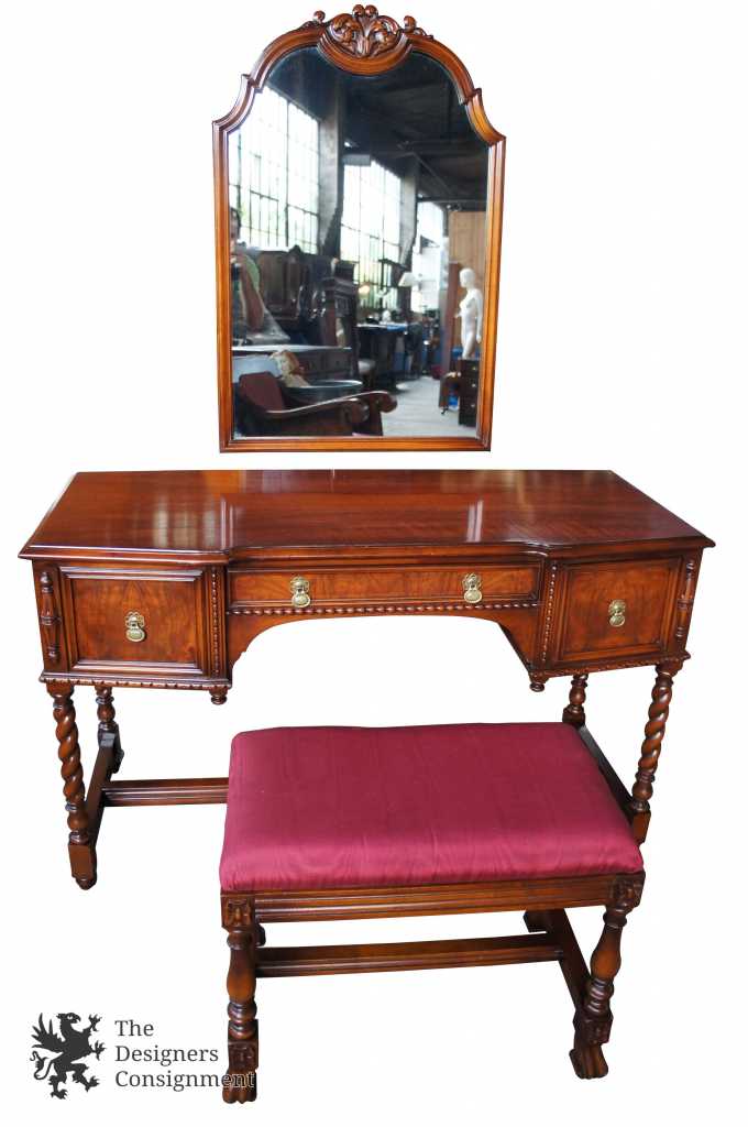 An exquisite crotched walnut dressing table and mirror with bench by Robert W. Irwin Furniture Company. Elegantly designed with matchbook veneered front. Includes brass mounted hardware, barley twist legs, carved accents, and pressed flourishes. There are 3 drawers of dovetail construction. Circa 1928-1940