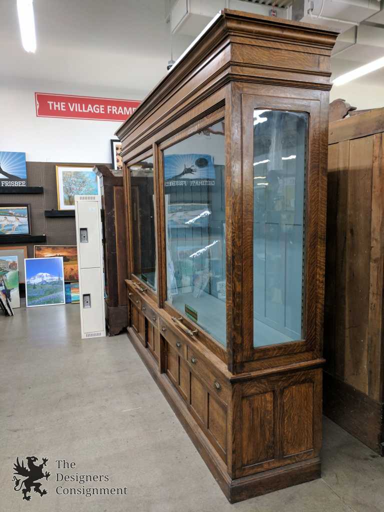 Up for consideration is a monumental Victorian general store display cabinet. Made from quartersawn oak with large weight driven doors that extend through the top. Most recently used in a music shop to display violins. Along the front are 4 dovetailed drawers above sliding doors. Doors and top come off for ease of movement.