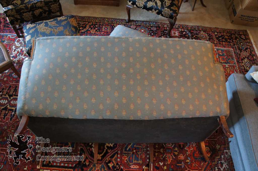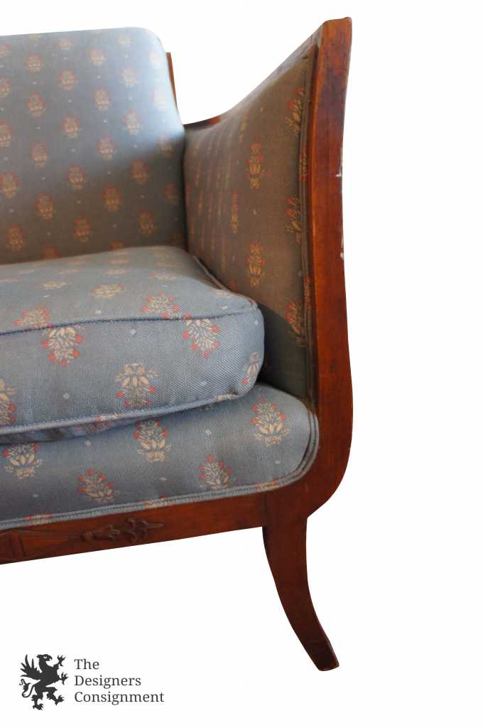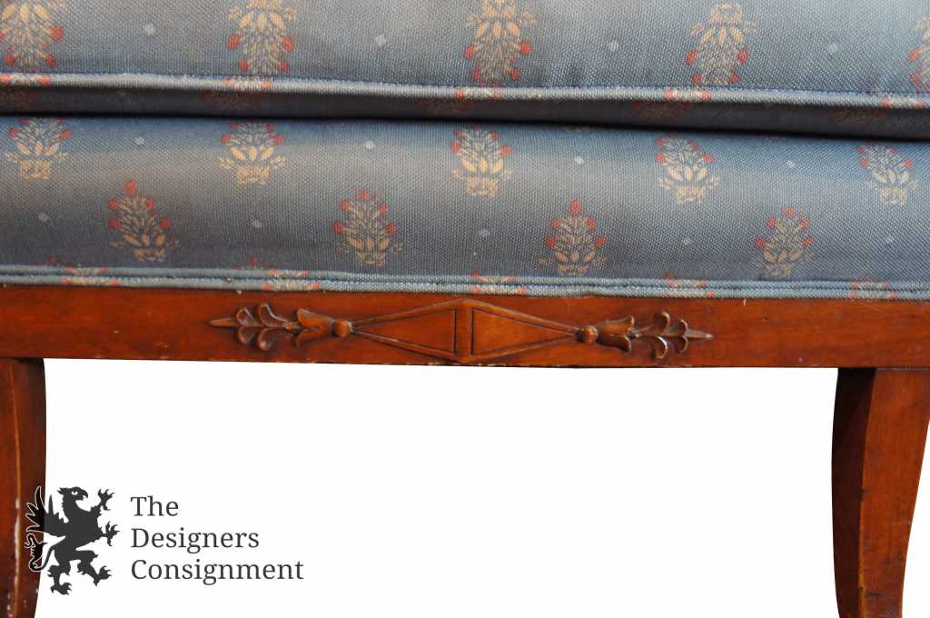 Late 19th to early 20th Century Neoclassical Style Sofa. Made from walnut with carved trim. Upholstered in blue with a floral design.