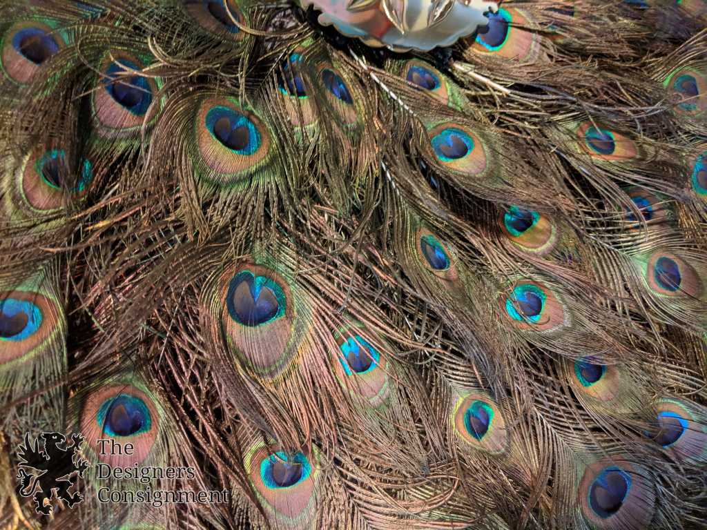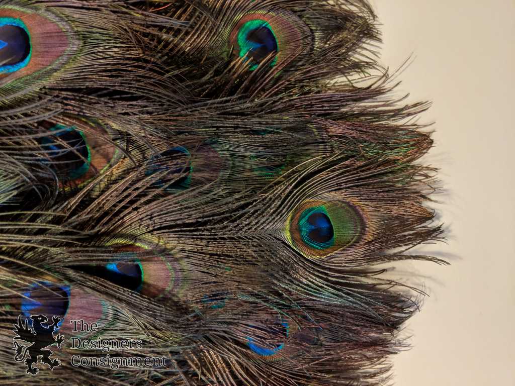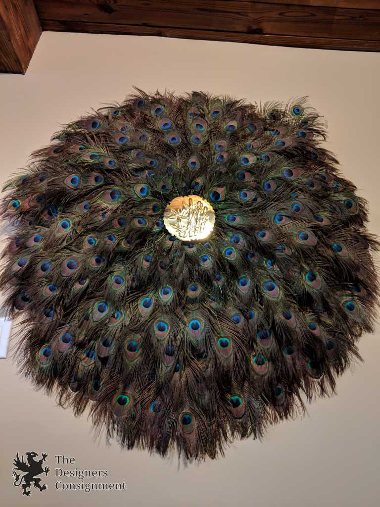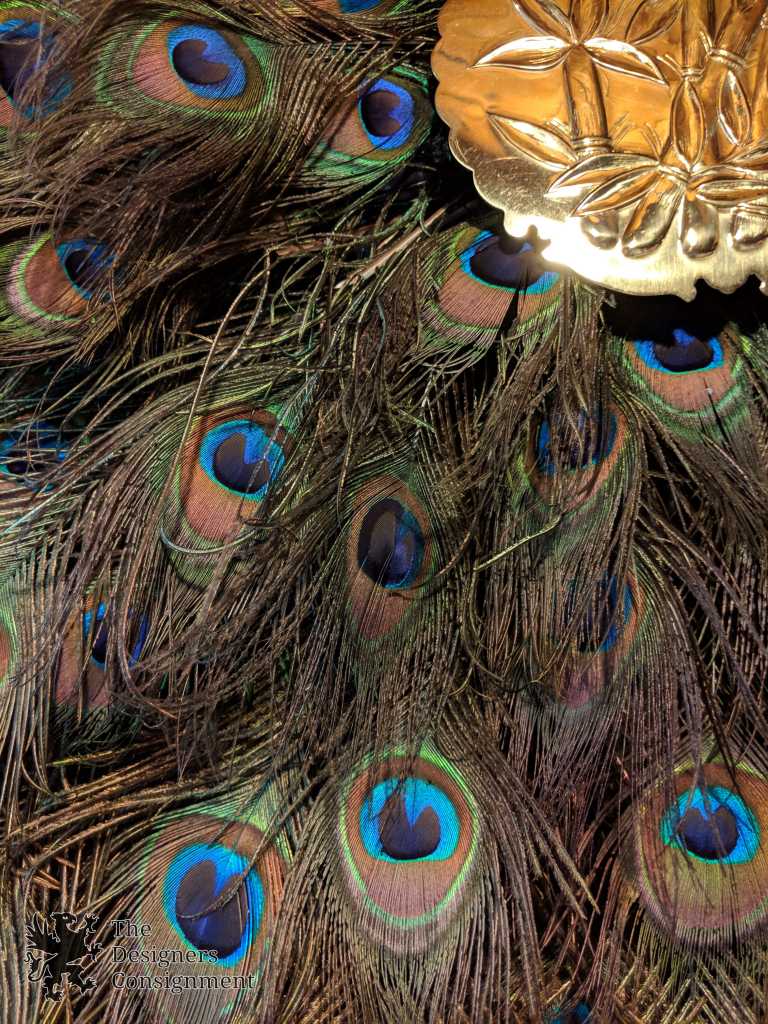 Handmade Peacock Wreath. The center is mounted with a brass bamboo decorated plate. The feathers are beautifully layered and as long as 22". A gorgeous piece for display in any setting
