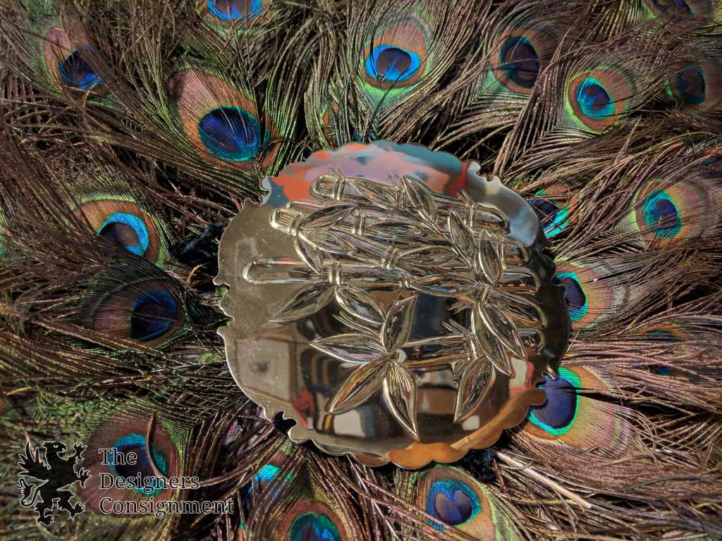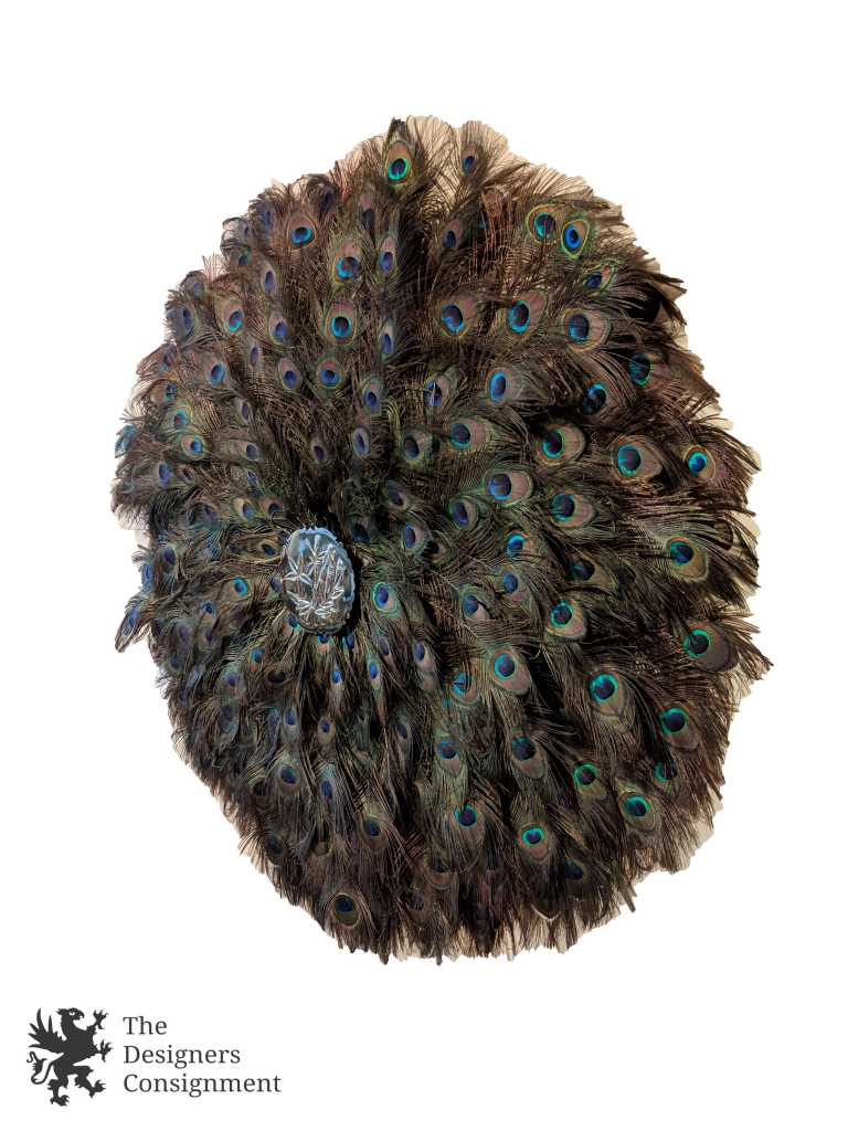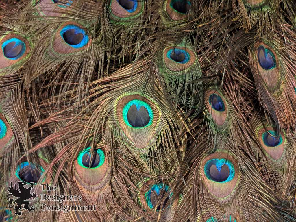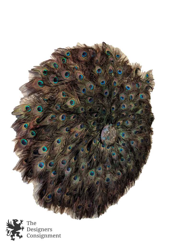 Handmade Peacock Wreath. The center is mounted with a brass bamboo decorated plate. The feathers are beautifully layered and as long as 22". A gorgeous piece for display in any setting