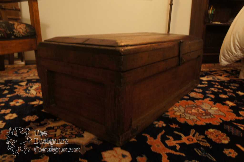 Beautiful early-mid 20th century oak trunk. Petite in size with iron hardware. Includes a removable interior compartment. Lid has a catch allowing it to remain open