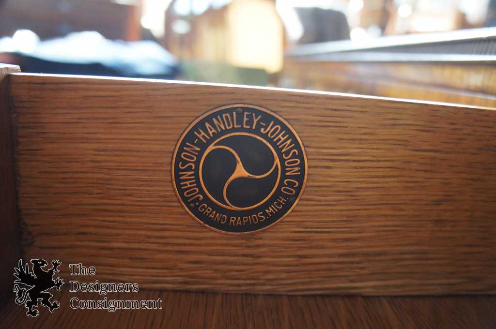 Johnson Furniture was founded in 1908 by three brothers (Carl, Hjalmar, and Axel) who emigrated from Sweden in 1887. Specializing in period revivals from the styles of Sheraton, Hepplewhite, Empire, Colonial and other European designs. Carl had received a medal for his cabinetmaking skills from the King of Sweden before moving stateside. He worked closely with their in house designer Tom Handley to create these beautiful masterpieces. Tom's designs featured intricate marquetry and elaborate carvings, like the one offered above. He became an officer of the company in 1922, holding this position until his death in 1926. At this point their label changed to Jonhson Handley Johnson paying homage to him. The company remained in business until 1983.
