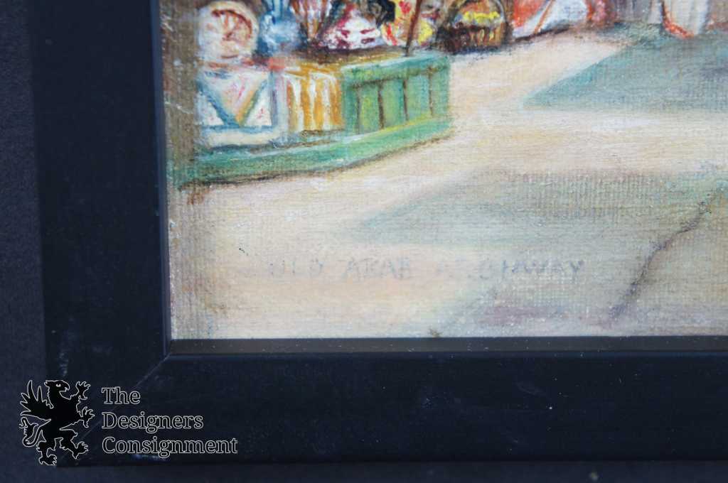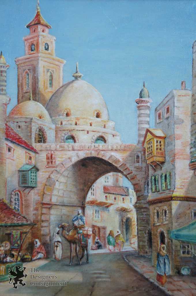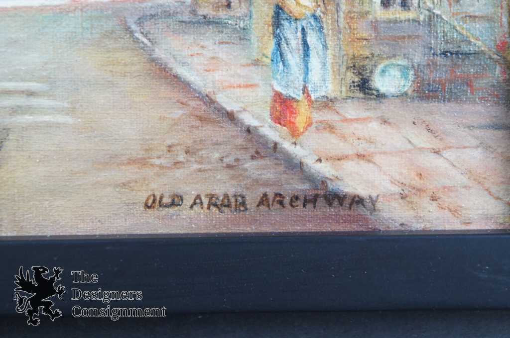 A peak through a corridor of an old middle-eastern town. Titled "Old Arab Archway". Oil on canvas in frame.