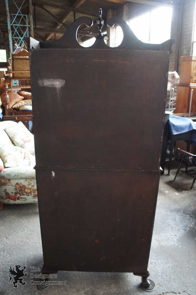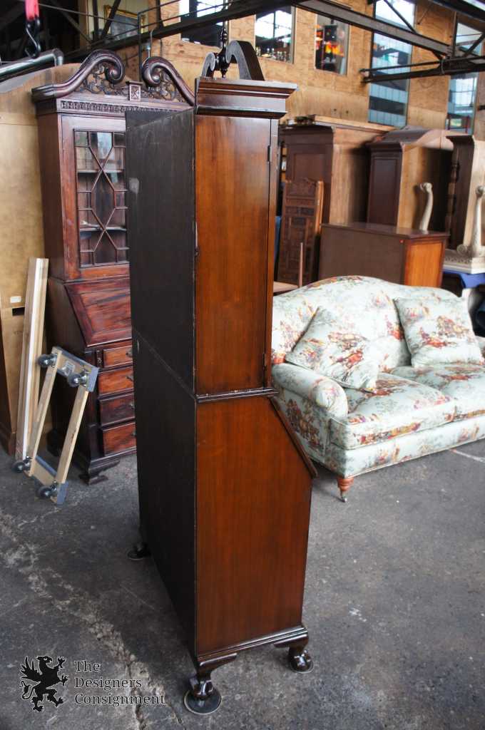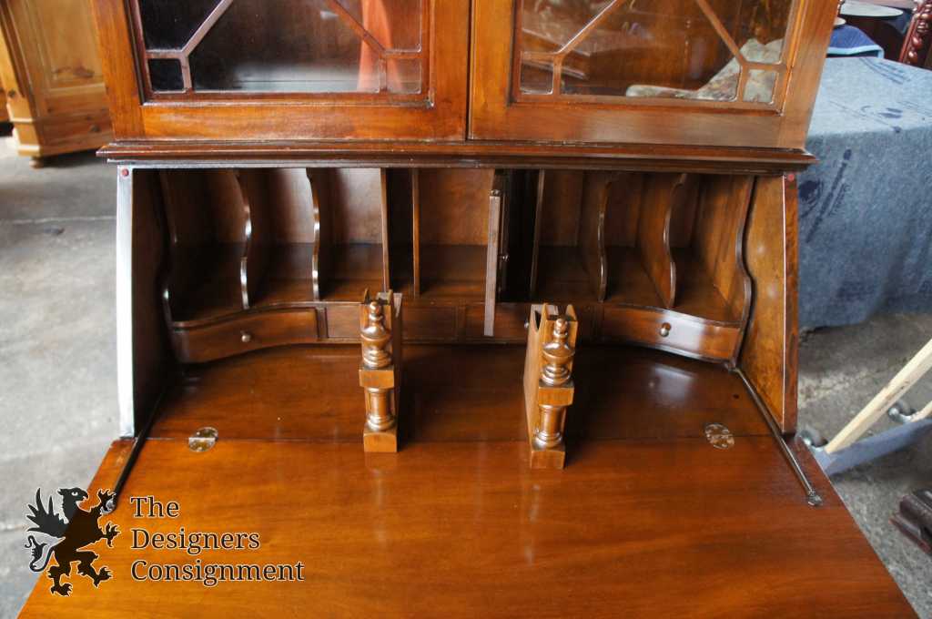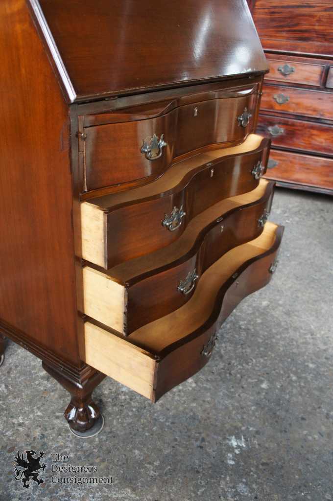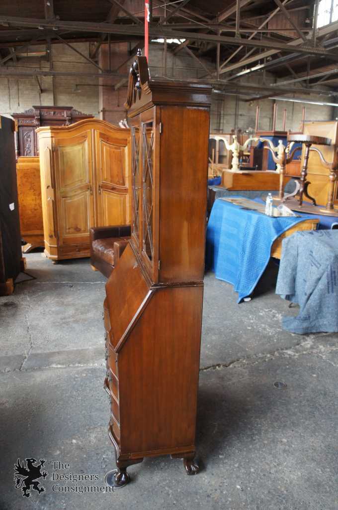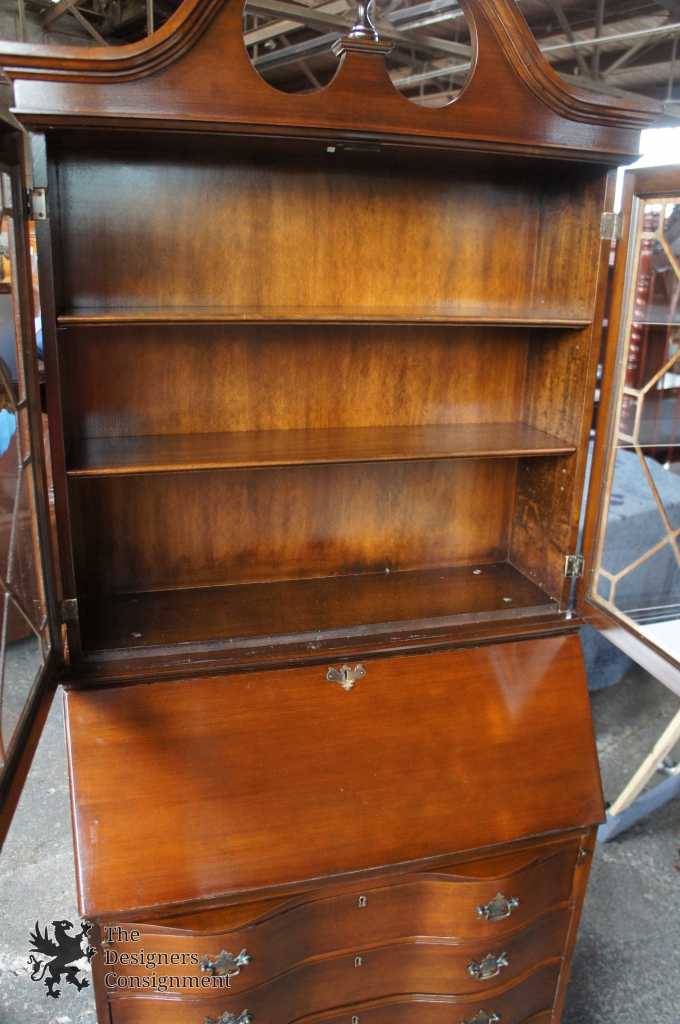 A gorgeous serpentine front 2 piece secretary desk. Made from walnut with ball & claw feet. Interior opens to cubbys and pigeon holes. Upper bookcase portion shows an open pediment with turned finial. Doors are glass with fretwork. There are 2 interior bookcase shelves. Hardware is made of brass in classic Chippendale fashion. Locks are functional.