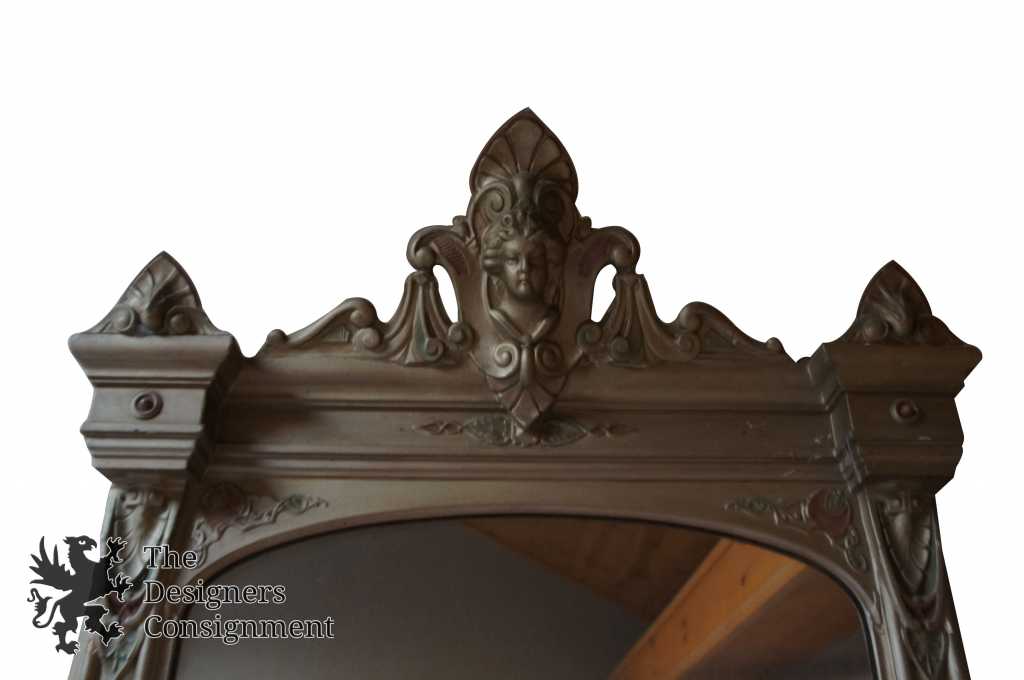 Victorian era pier mirror. Made from wood with high relief gesso carvings. A figural design can be seen along the top of the mirror and center of the bases. Most likely a depiction of Queen Elizabeth. The mirror sits on a marble top. Finished in an aged gold