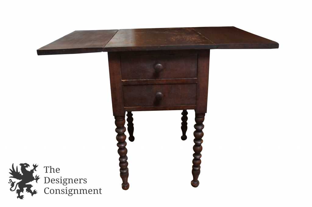 Antique drop leaf end table featuring two drawers and spindle legs.