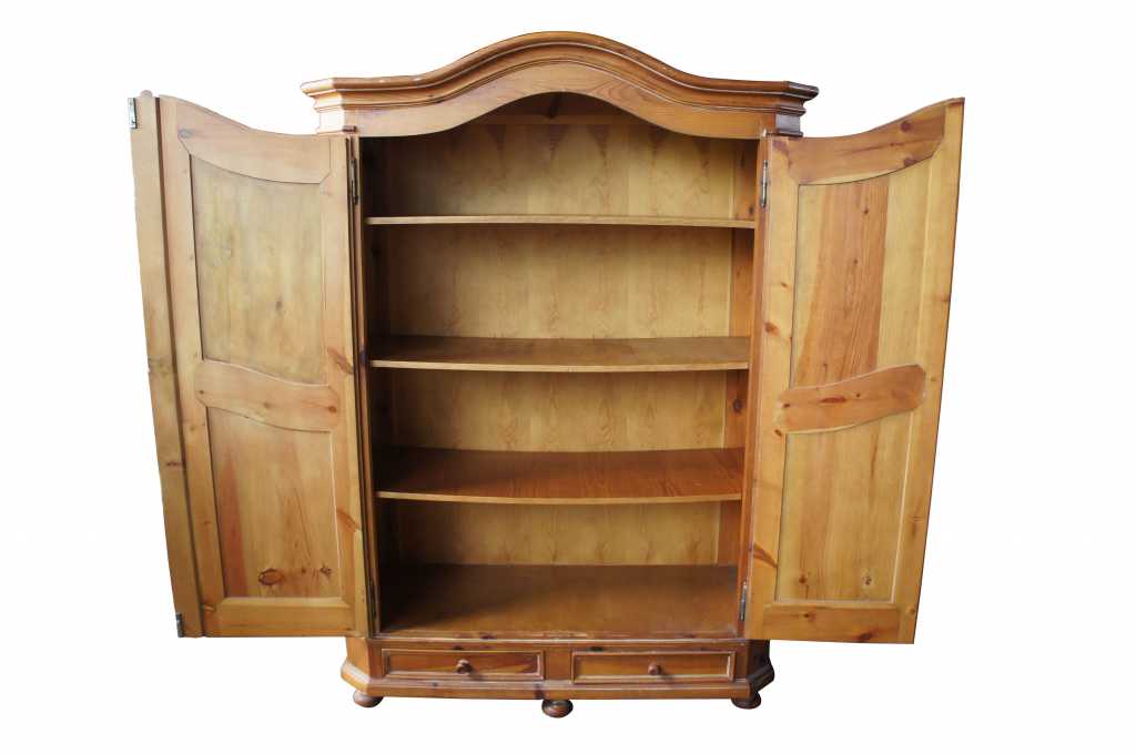 An exquisite armoire from Garcia Furniture Designs of California. Made from a distressed pine with white wash trim. Includes 3 adjustable interior shelves, lower drawers and a key for locking. Garcia specializes in reproducing old world designs using solid woods. A family business building of of 3 generations of craftsmanship.