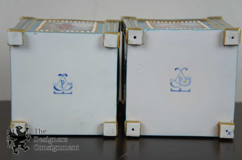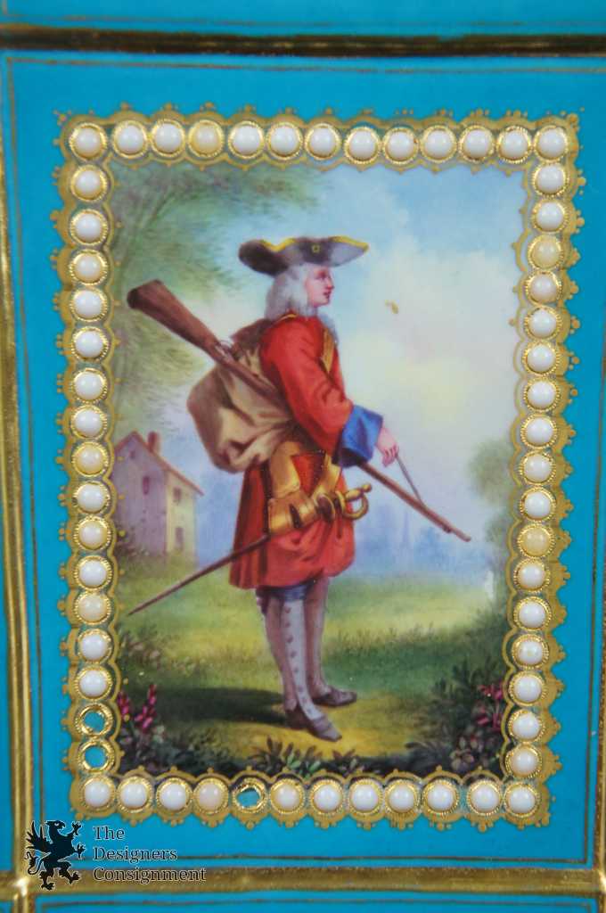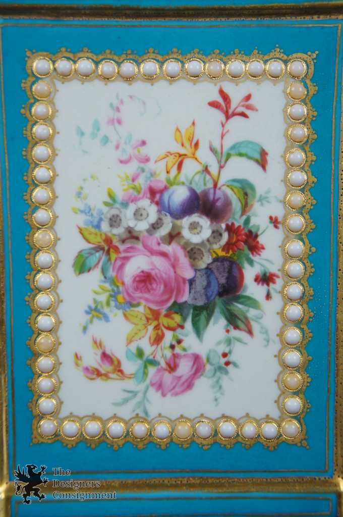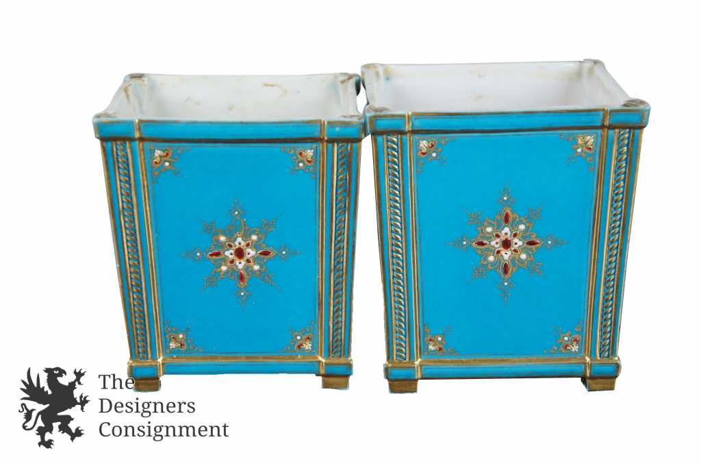 Up for consideration is a stunning pair of Sèvres cachepots. Sèvres was one of the principal porcelain manufacturers in all of Europe that opened in the 18th century. Their pieces were consistently seen amongst political, royal and imperial order. Their principle mark of crossed "L"s or "double Louis" distinguish each piece. These gorgeous cachepots bear a "P" within this mark which dates them to 1768. These ornamental flower holders are made from porcelain with a turquoise color. Each is exquisitely detailed with Botanicals and scenes from the American Revolution. Trimmed in gold with a filigree design amongst red and white beads. The perfect compliment to any setting.