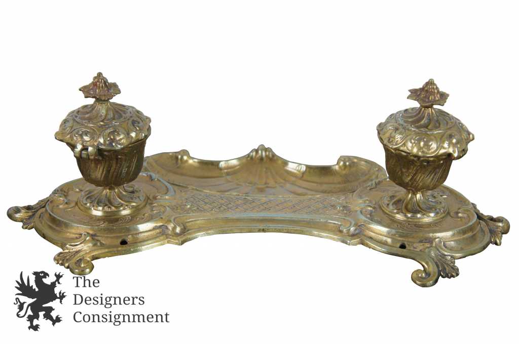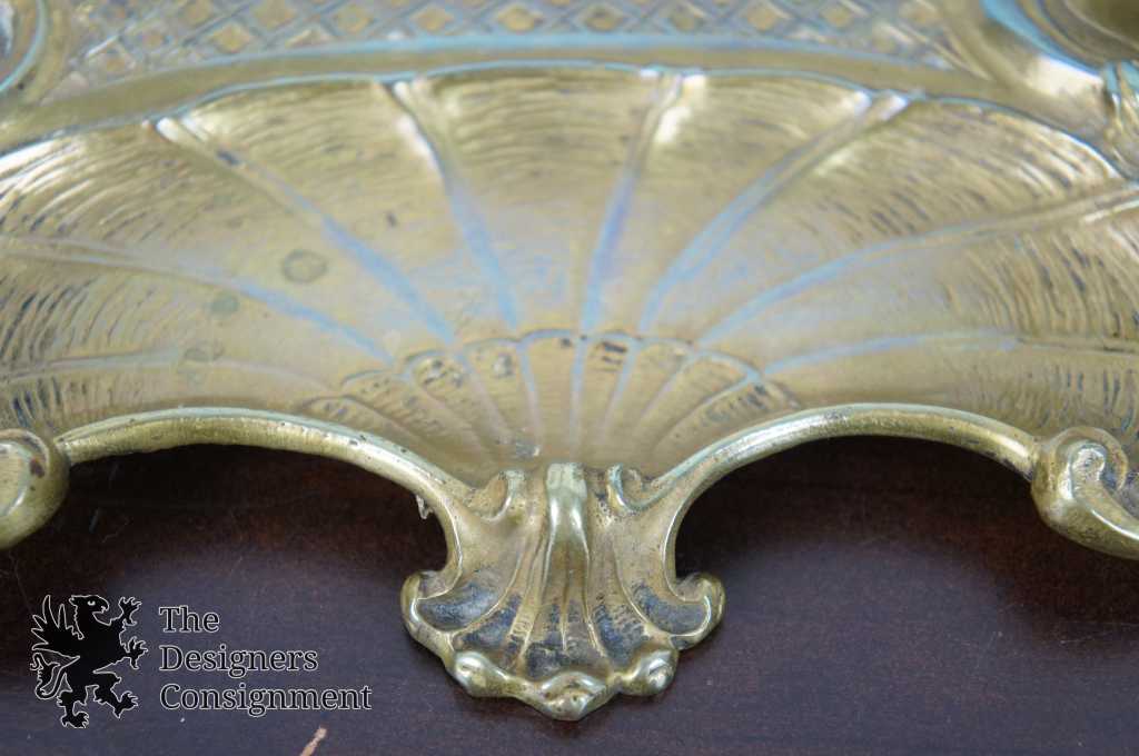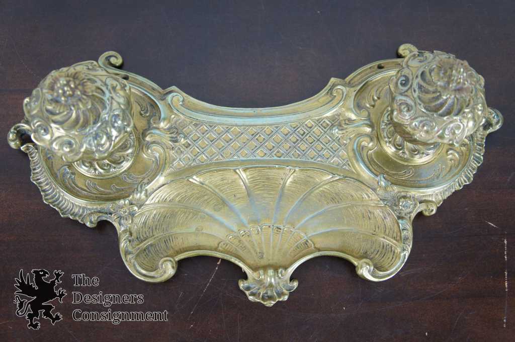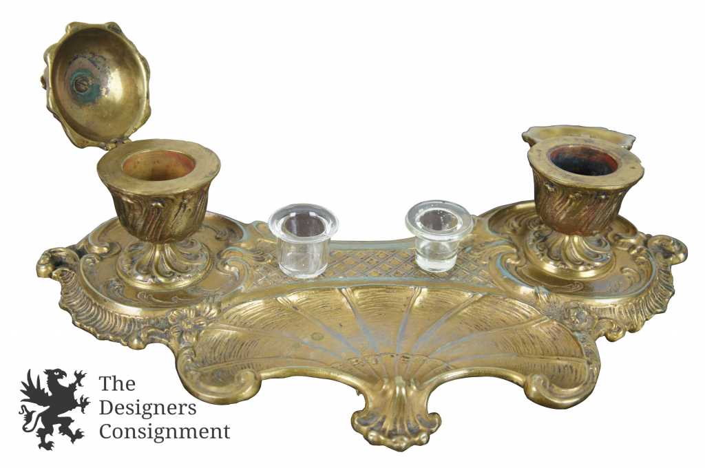 Art Nouveau, a style of decorative art, architecture and design prominent in western Europe and the US from 1890 until WWI characterized by intricate linear designs and flowing curves based on natural forms. This gorgeous period piece is elegant yet simple with perfectly placed scalloped accents. A double inkwell with pen stands. A neat addition to any writing area.