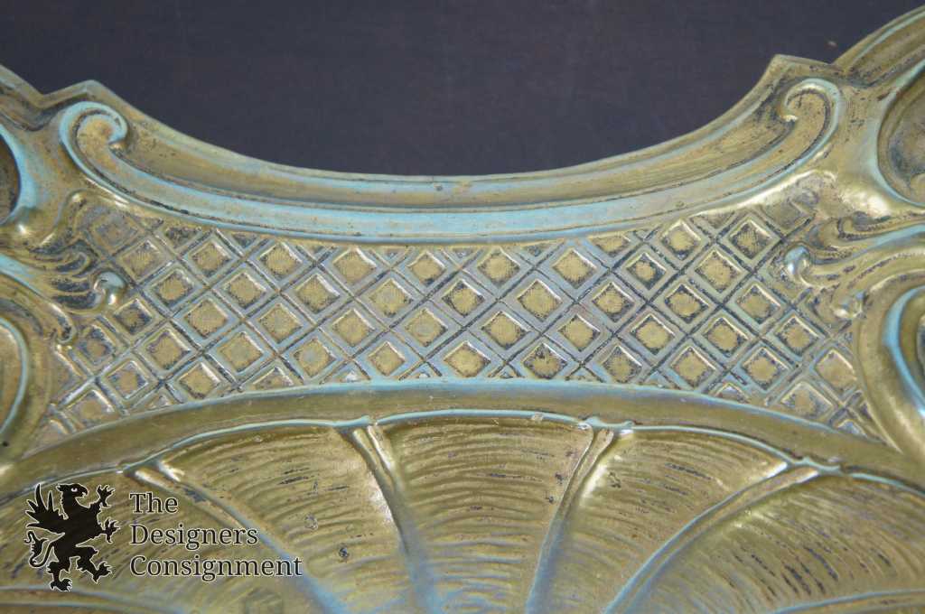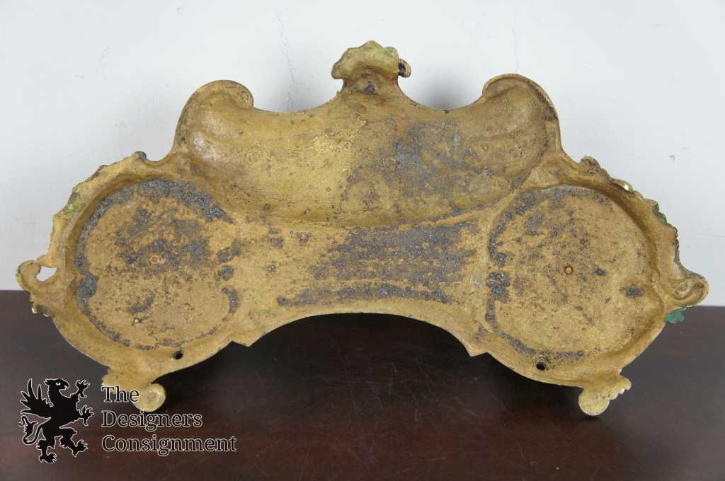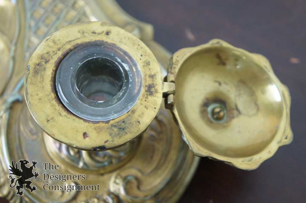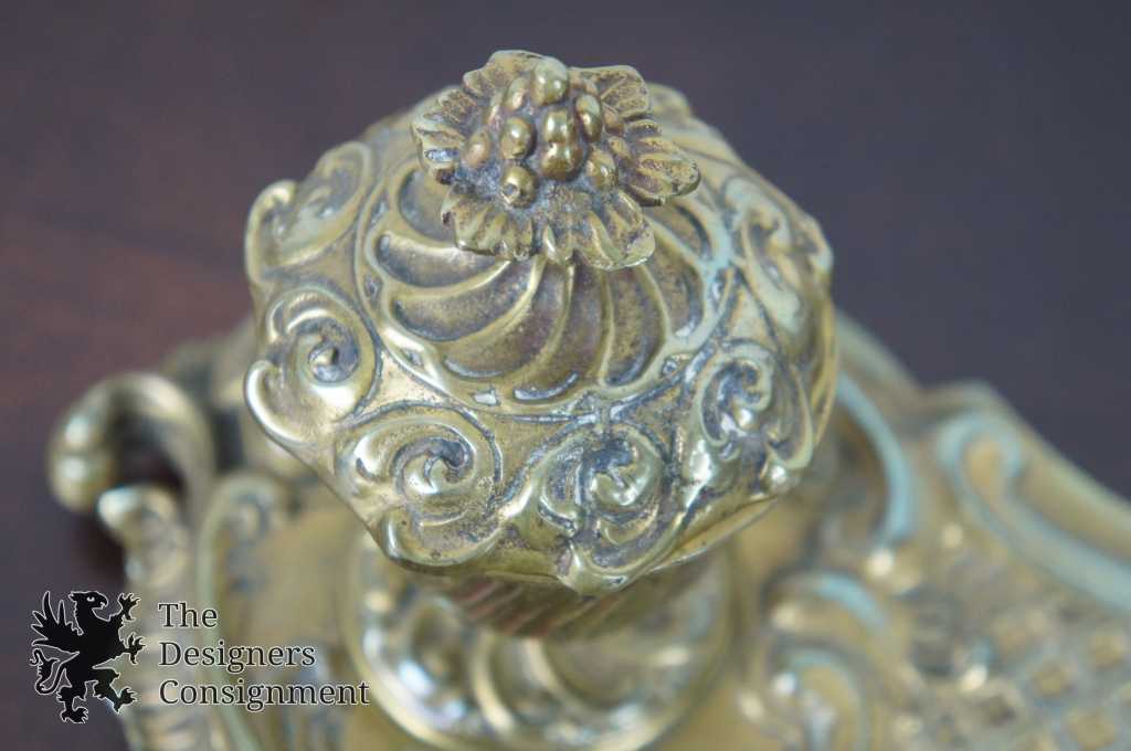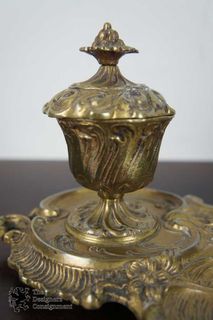 Art Nouveau, a style of decorative art, architecture and design prominent in western Europe and the US from 1890 until WWI characterized by intricate linear designs and flowing curves based on natural forms. This gorgeous period piece is elegant yet simple with perfectly placed scalloped accents. A double inkwell with pen stands. A neat addition to any writing area.