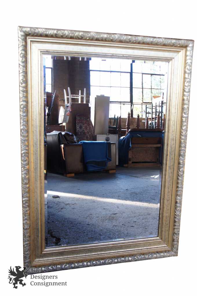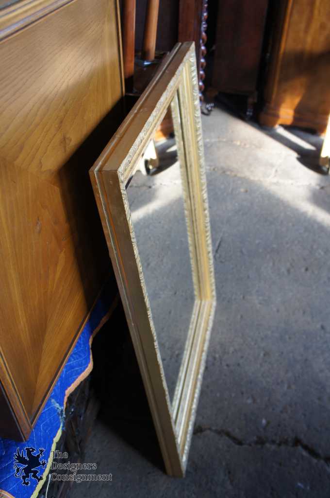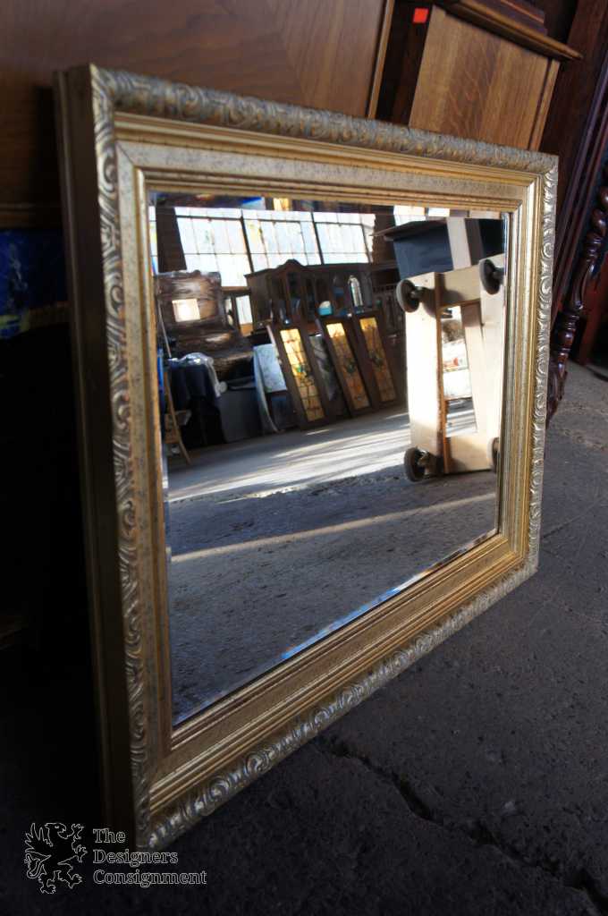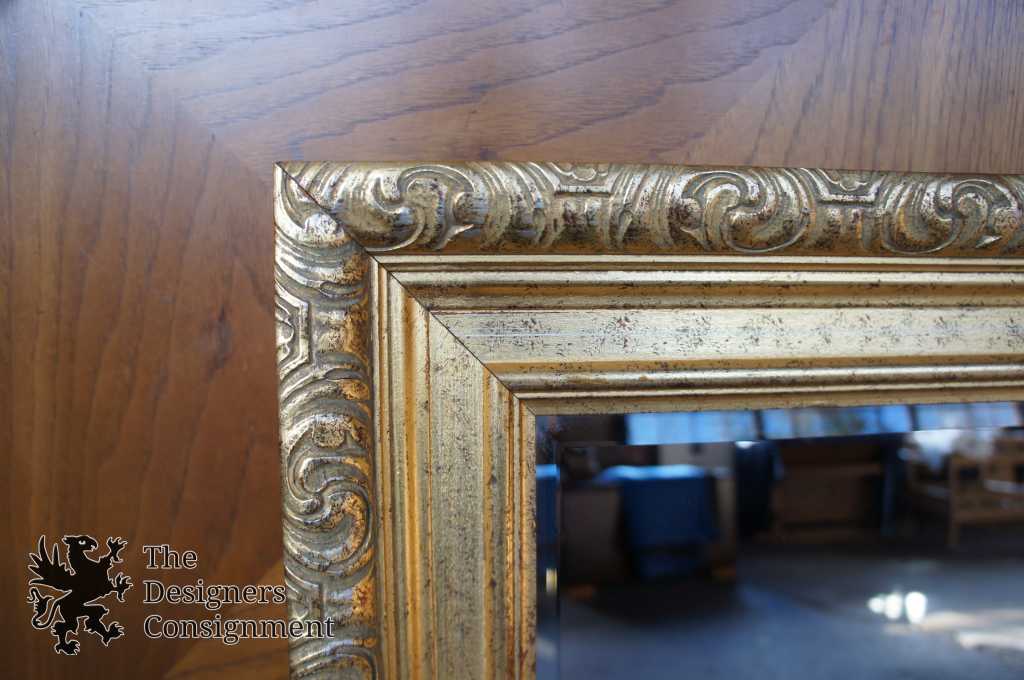 Hollywood Regency style wall hanging mirror. Features a carved frame with beveled glass.