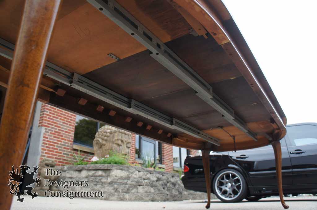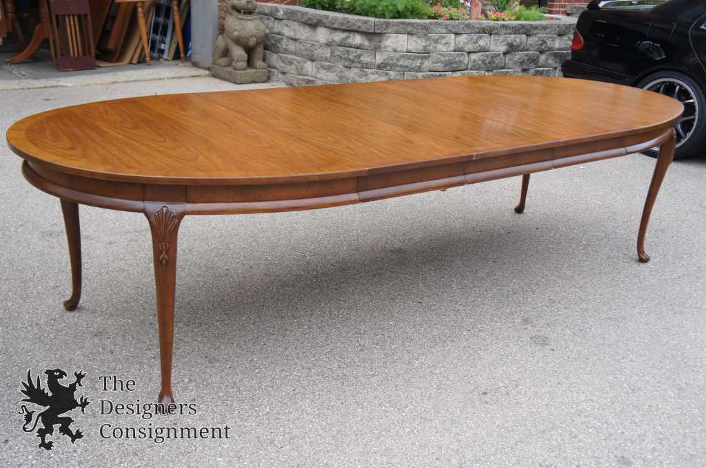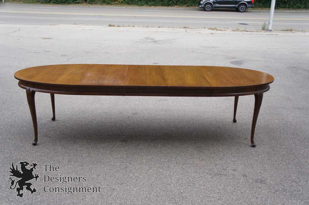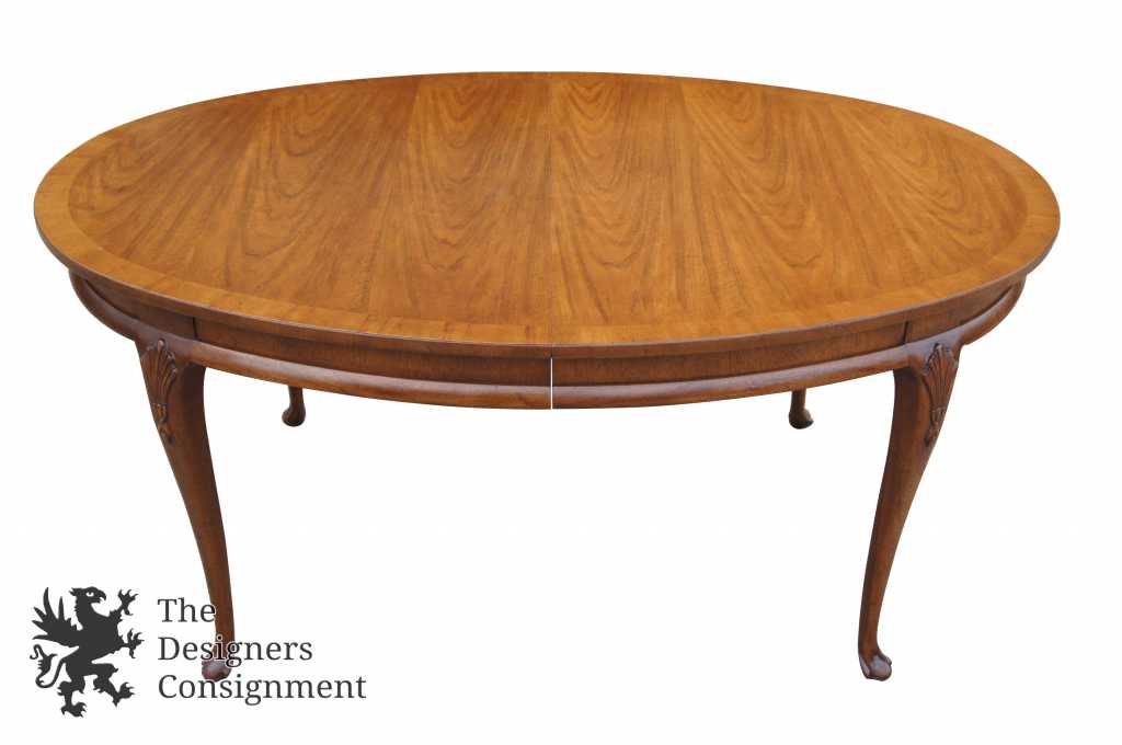 This beautiful Queen Anne dining table was designed by him during his time working for Mt. Airy Furniture in the 1960s. Made from a distressed walnut with a round extendable top and cabriole legs. Part of an entire dining room suite from an estate in Dayton, Ohio