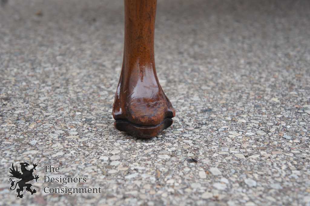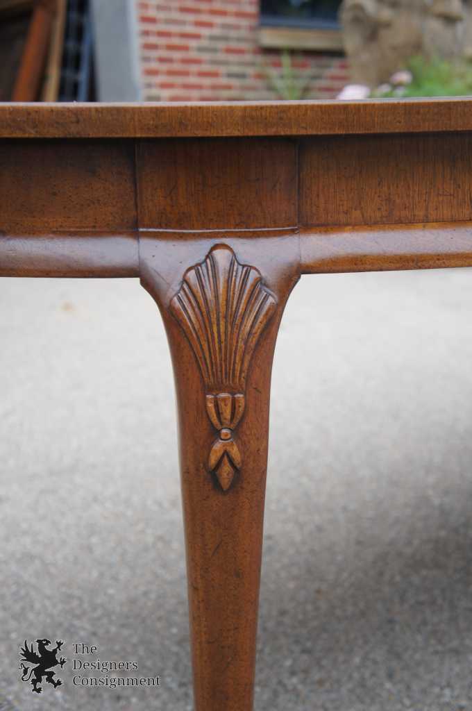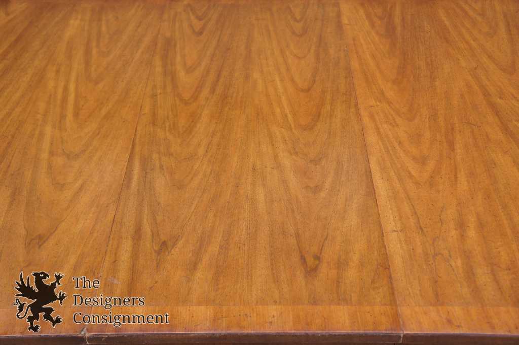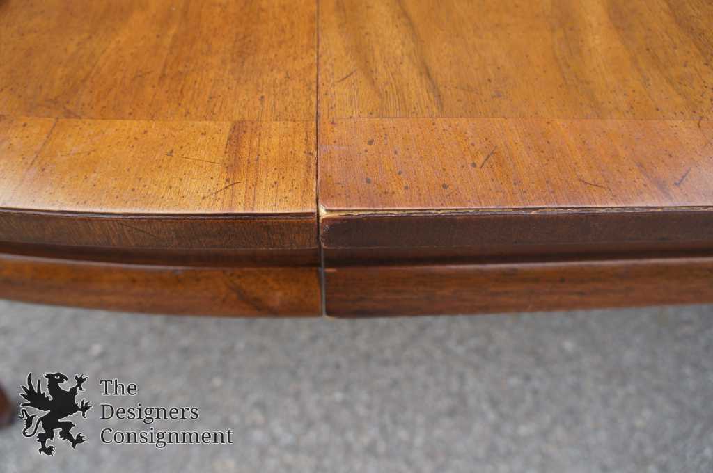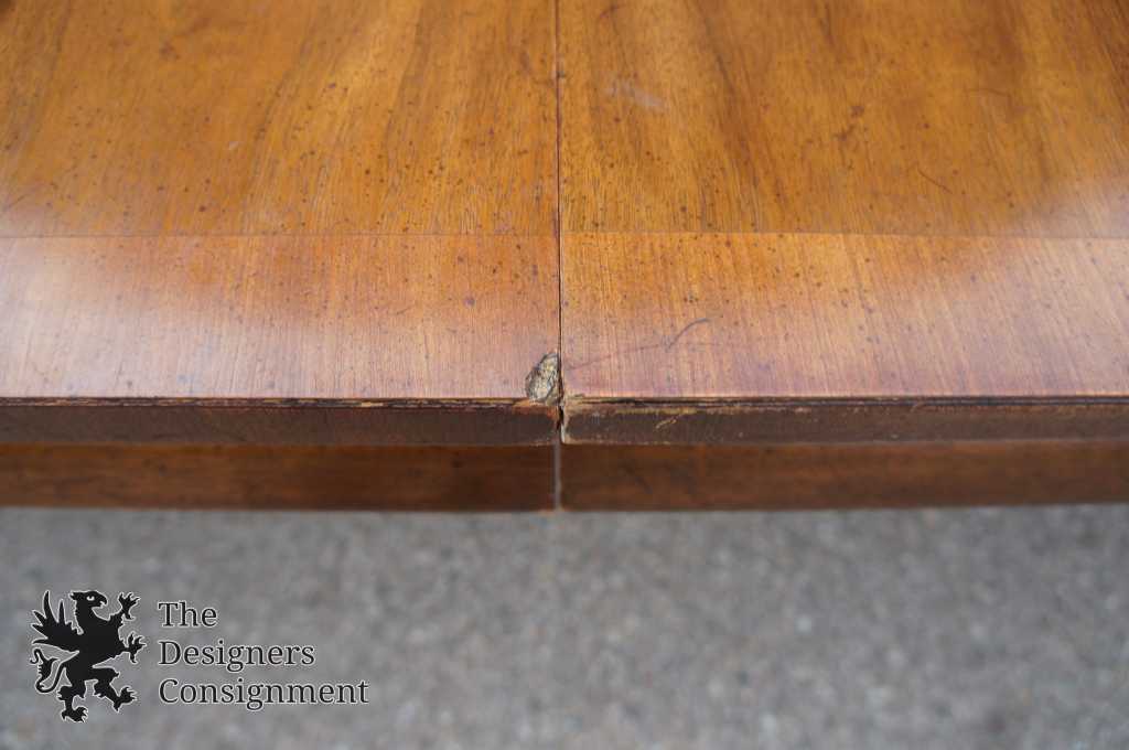 Good Overall Condition. A beautiful walnut grain along the top. Some finish loss to the feat, and a nick and veneer piece missing along leafs. The legs to this table are not removable