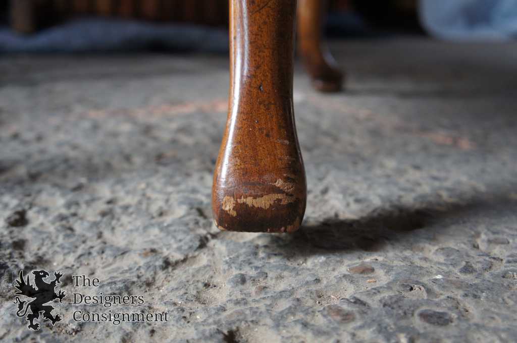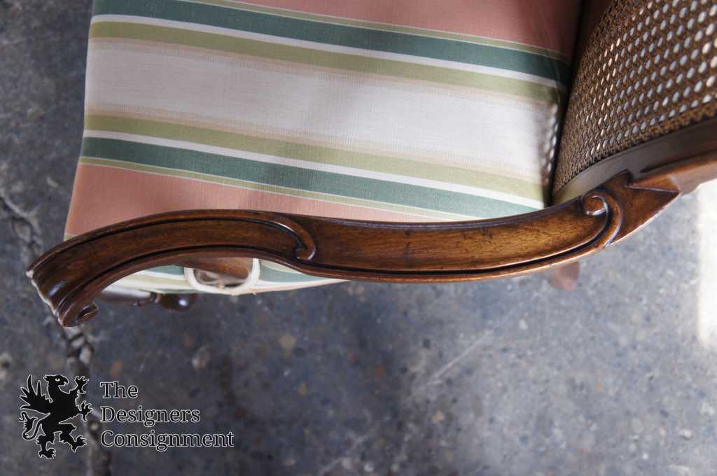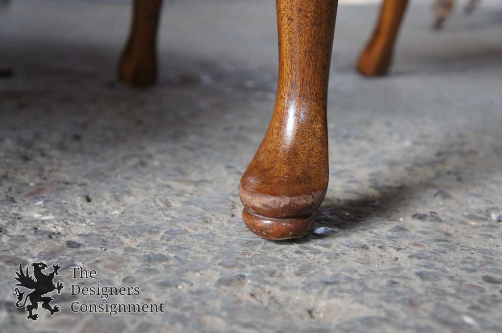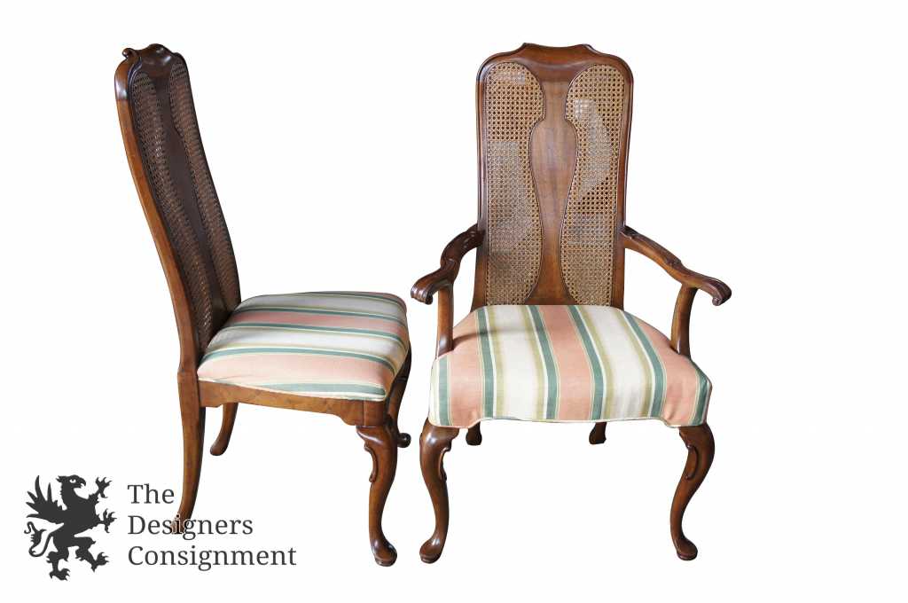 These beautiful Queen Anne chairs were designed by him during his time working for Mt. Airy Furniture in the 1960s. Made from a distressed walnut with cane back and striped seat. Part of a dining room set from an estate in Dayton, Ohio