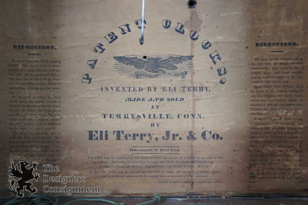 Early 19th century Federal Era weight driven wall clock by Eli Terry, Jr. & Co. Eli Terry Junior left the highly successful family firm that was started by his father in 1828, and moved to Plymouth, Connecticut to build a new factory. There he produced shelf clocks until he died from overwork in 1841.