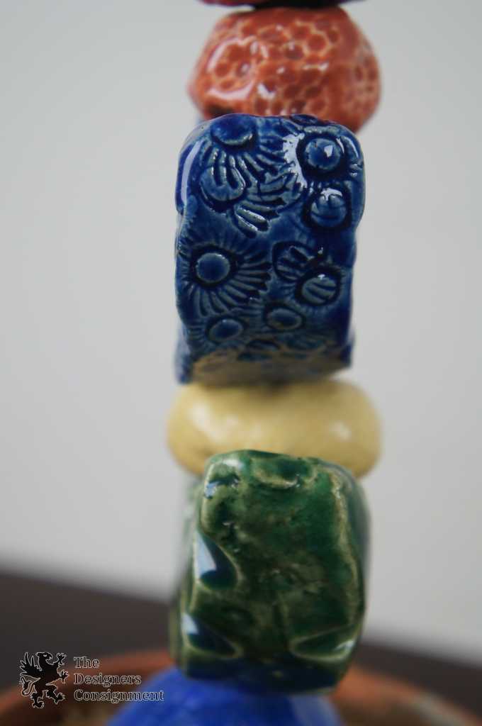 Features multicolor stacked ceramic blocks that mimic a tulip shape.
