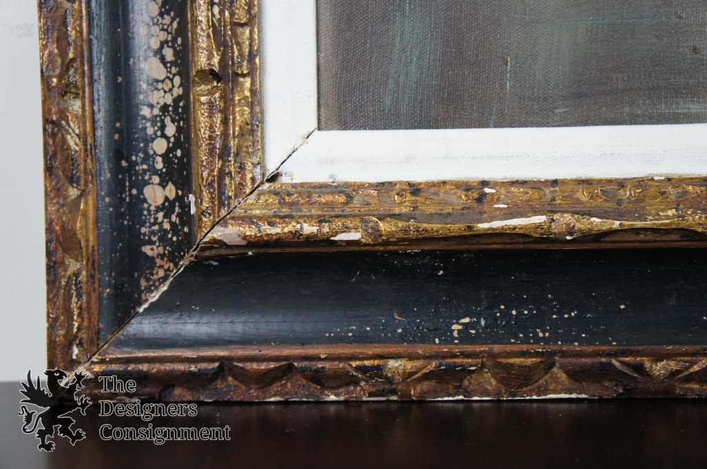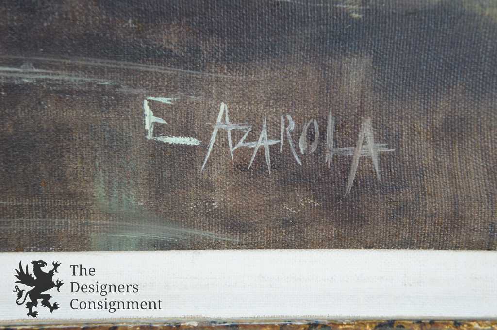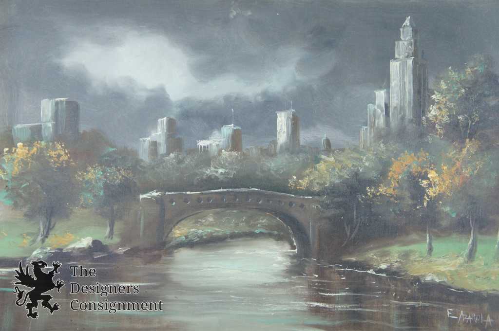 A beautiful landscape by Emilio Azarola. Shown in an evening setting by the water along tree-side with a bridge and buildings in the distance. Signed lower right and framed with a mat.