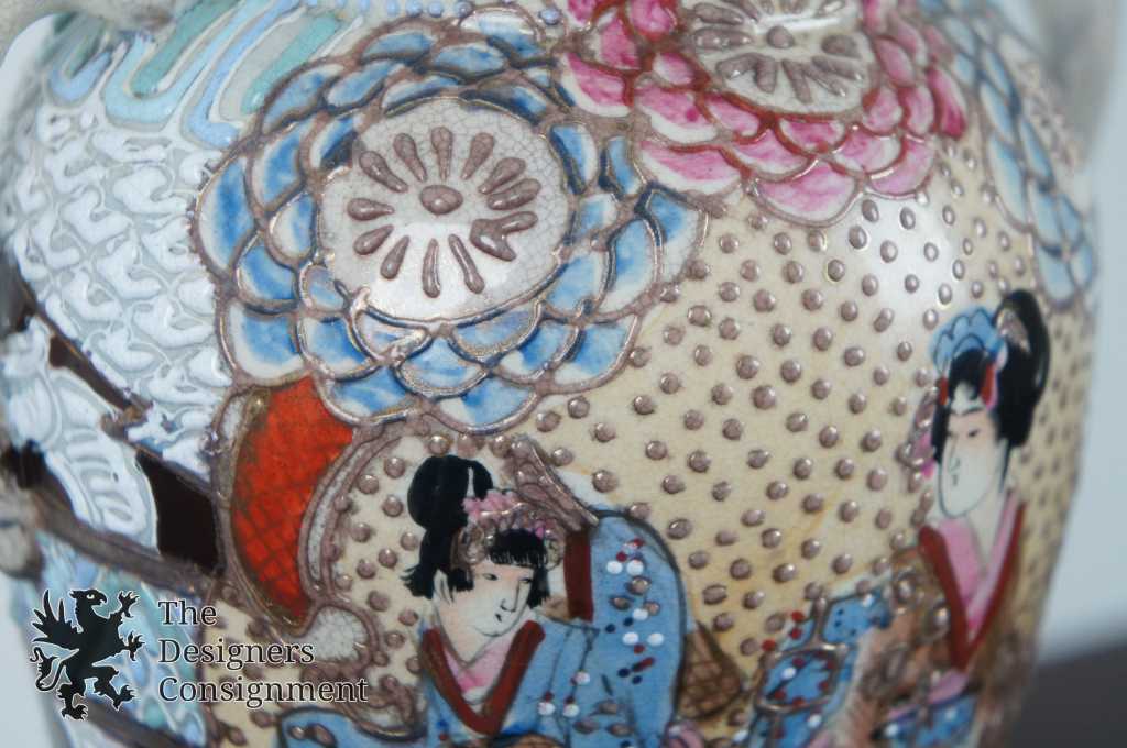 Features elaborate raised polychrome and gold design with samurai, geishas and handles.