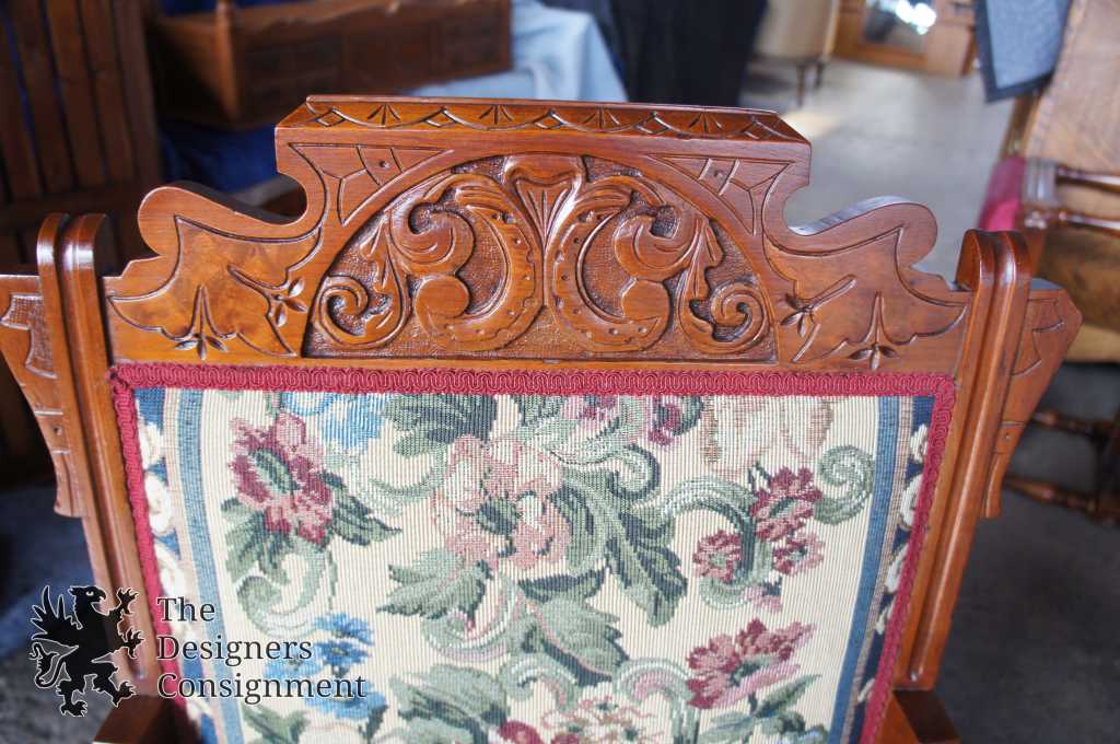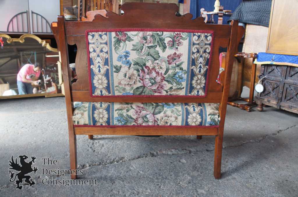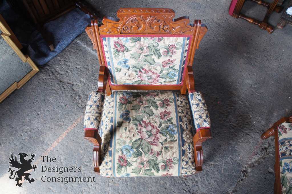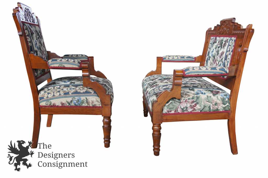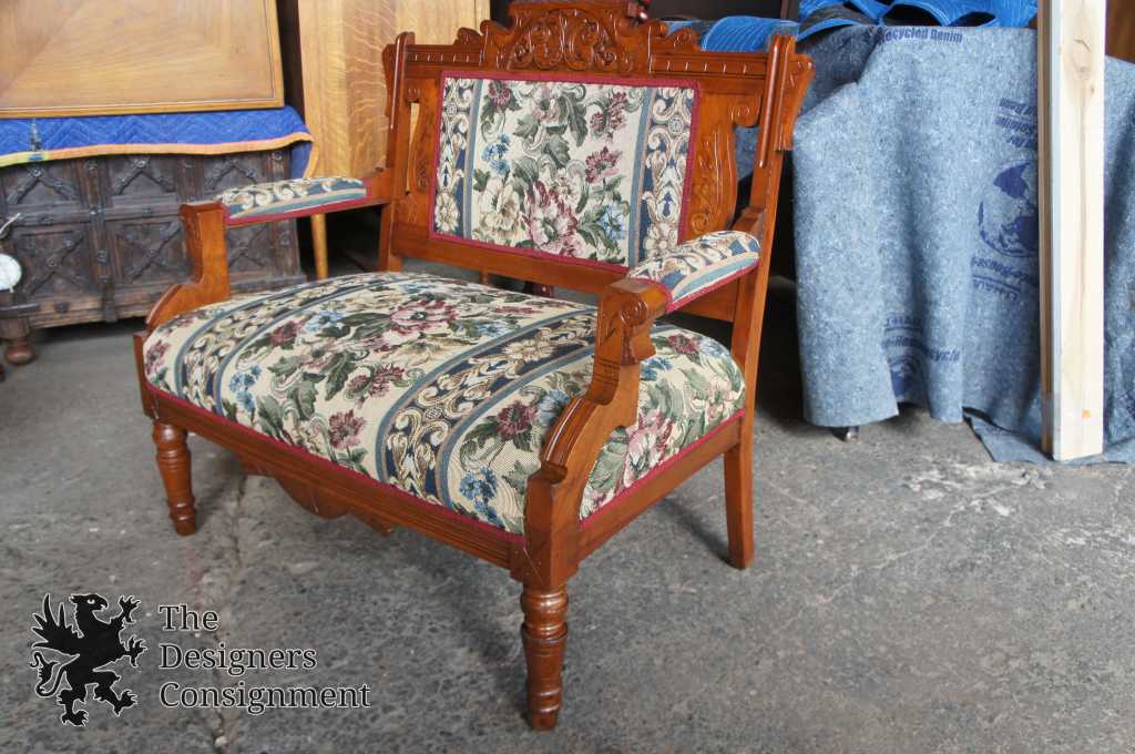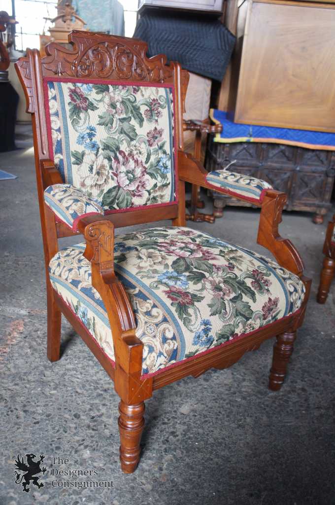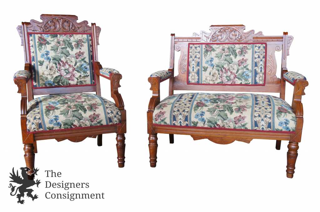 Up for consideration is an elegant late 19th century parlor setter and chair with ottoman. Made from walnut with intricately carved detail and burled panels. Upholstered in a floral fabric. A neat addition to your sitting area.