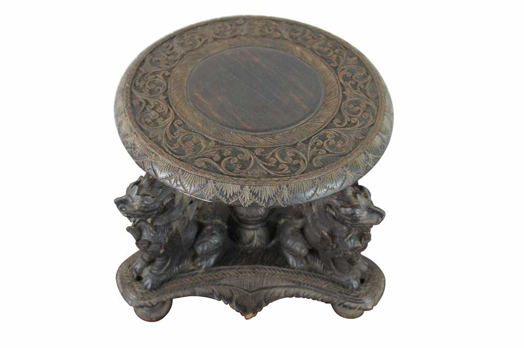 Ebony carved dragon pedestal. Includes 3 meticulously detailed animals over a footed base. The round top shows a filigree design. Perfect for display of your favorite sculpture or plant. Circa 1930-1950s