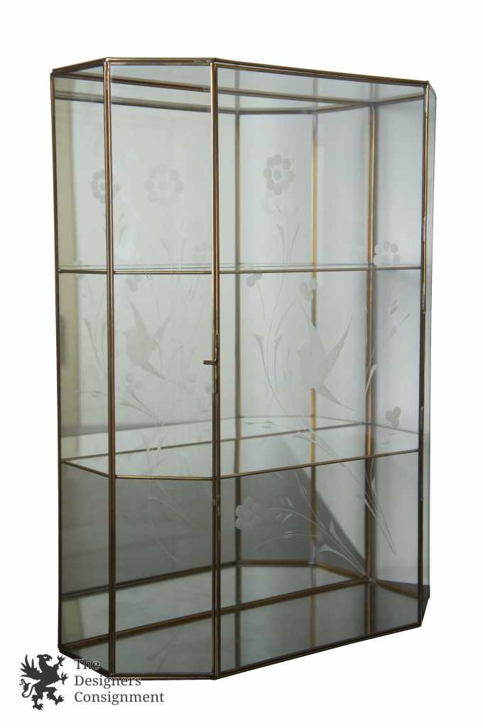 A beautiful 3 shelf brass framed curio cabinet. Perfect for hanging along the wall or placed on top of a table. Features a mirrored back and etched glass front with bird scene.