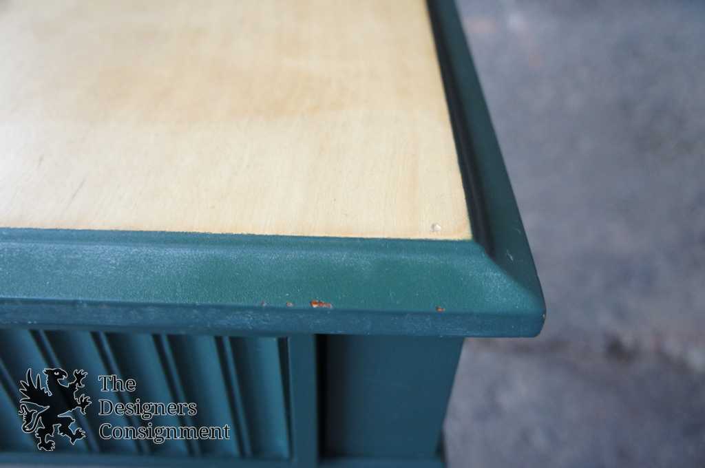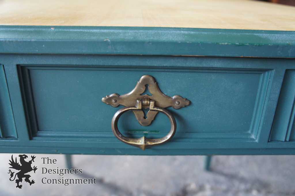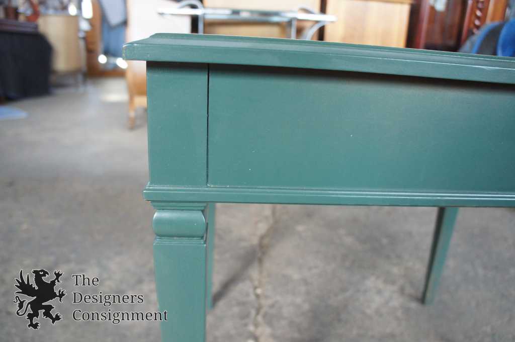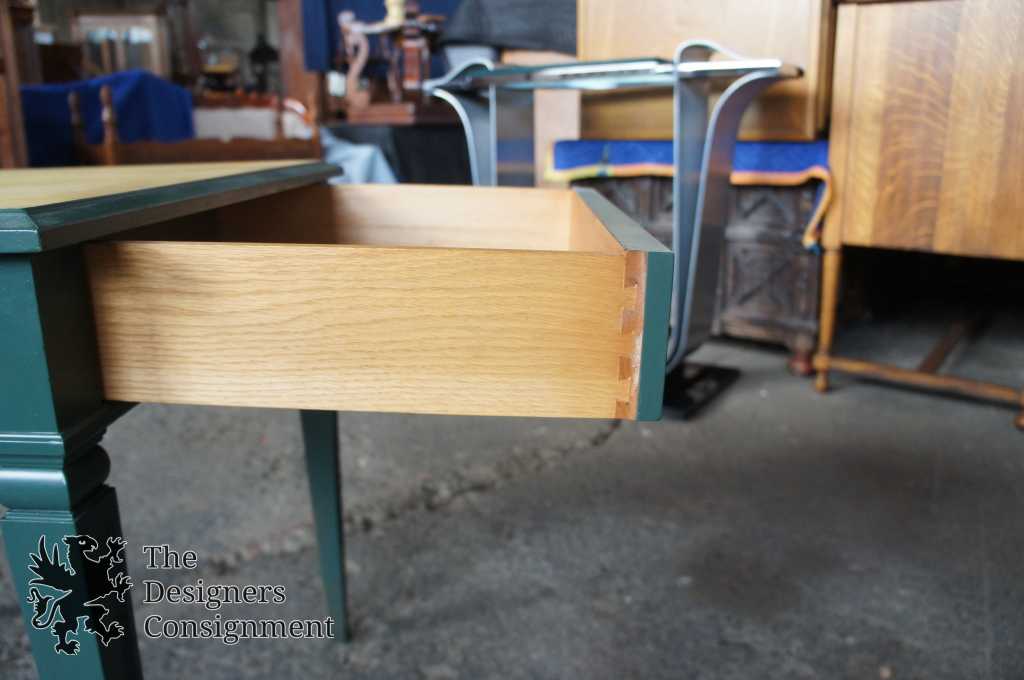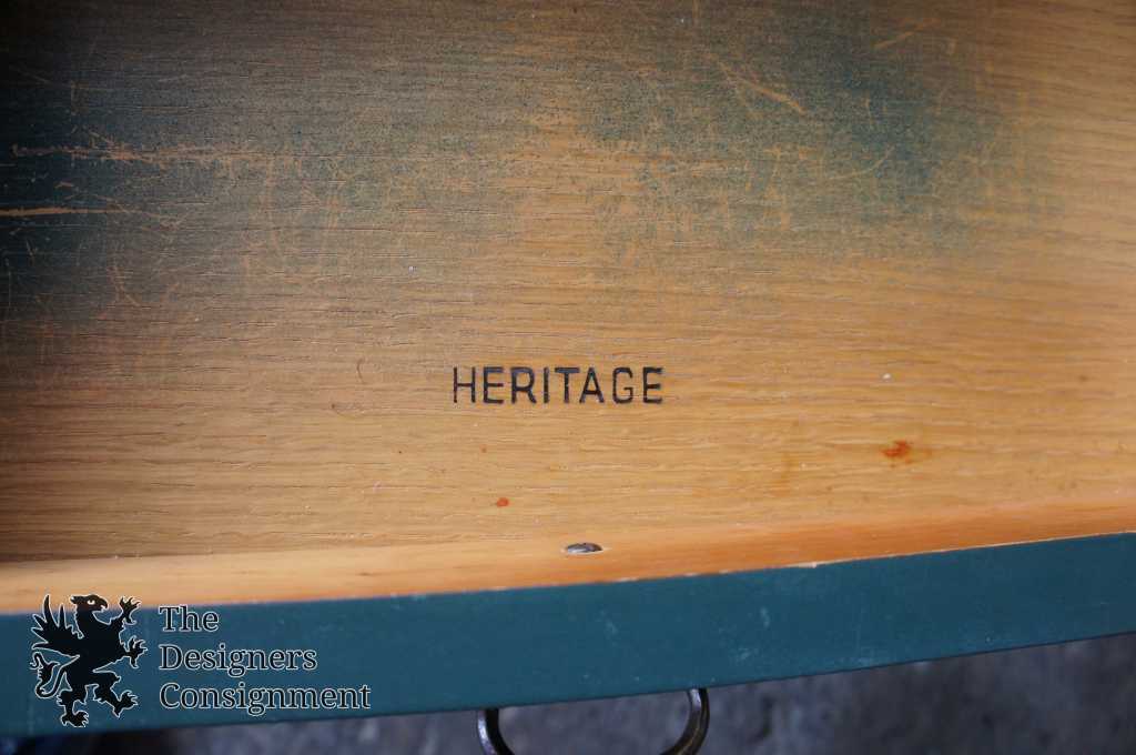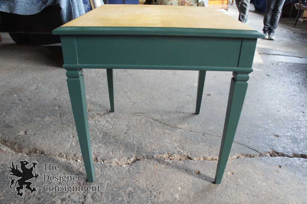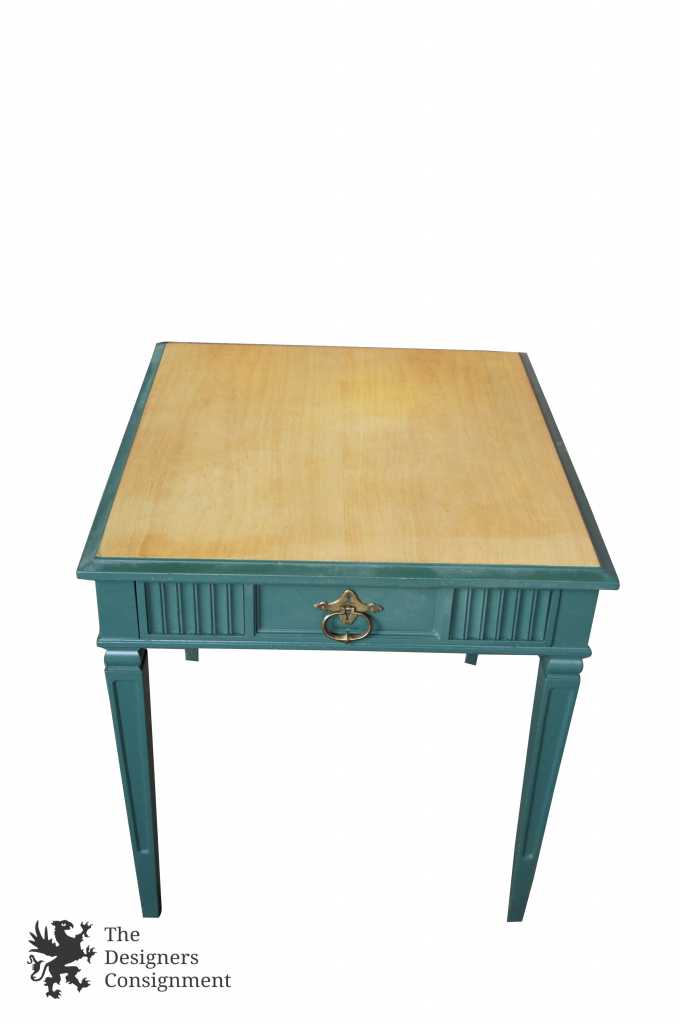 A neat vintage Drexel Heritage traditional accent table. Green with natural wood top. Includes a centrally located dovetailed drawer with chippendale style hardware and tapered legs. A great compliment to any setting.