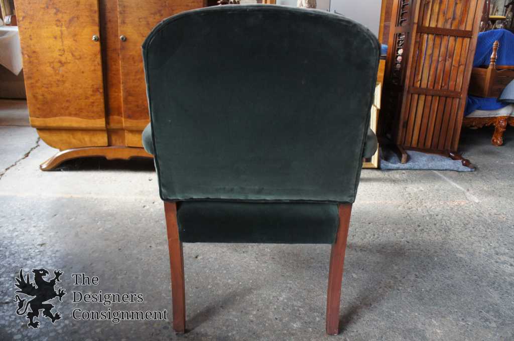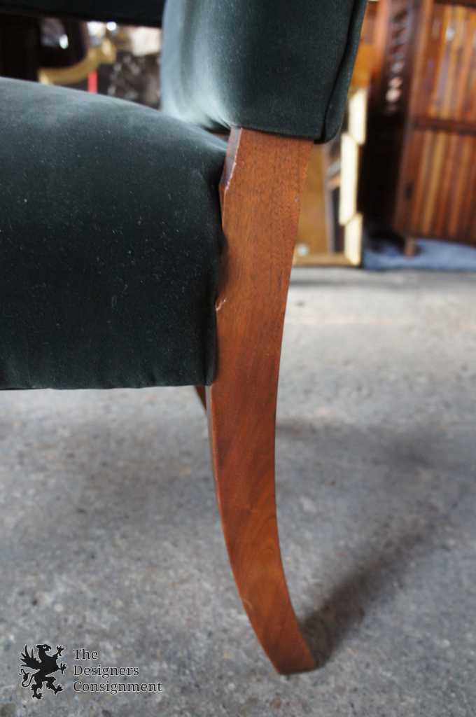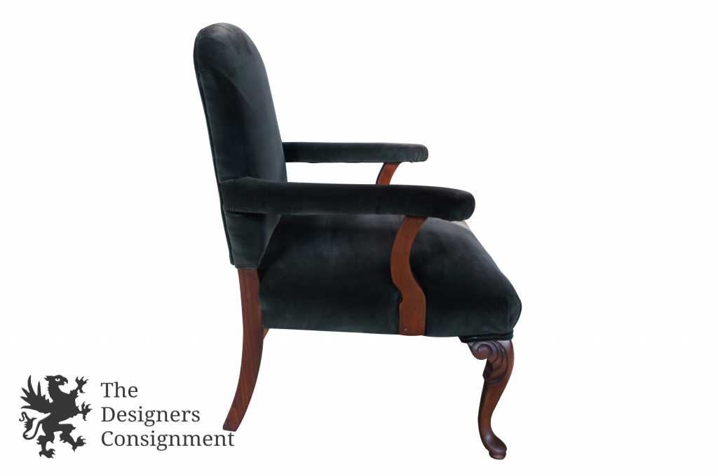 Beautiful green upholstered chair. Mahogany finish with cabriole carved legs and pad feet.