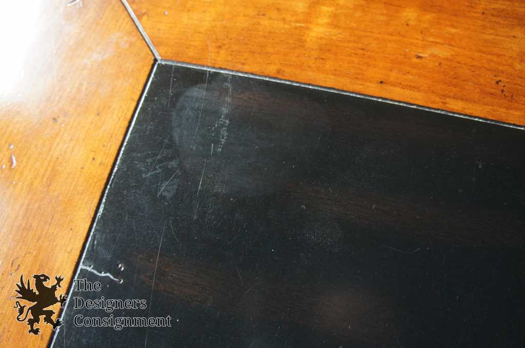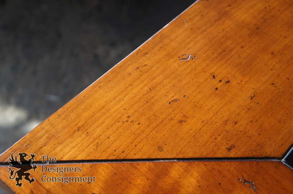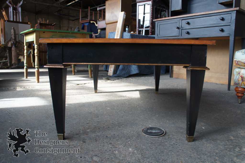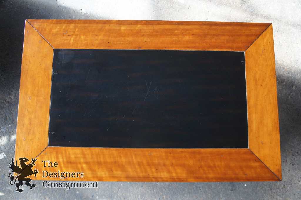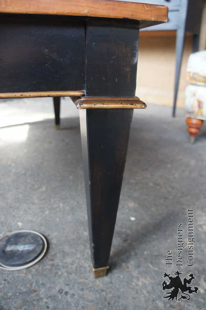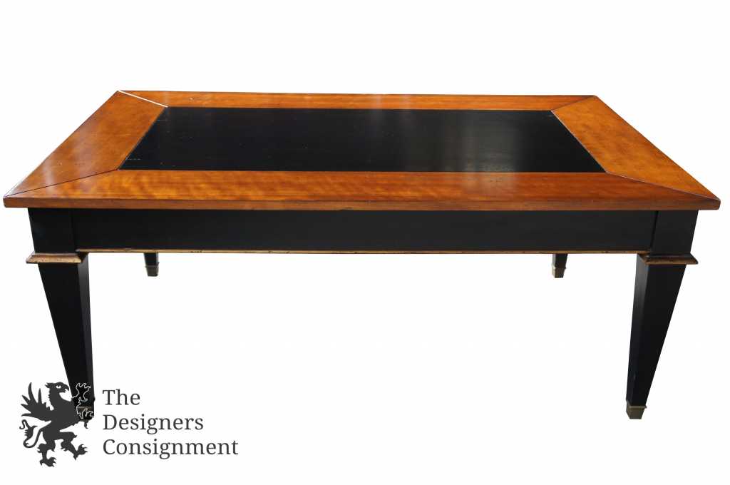 Lillian August for Drexel Heritage regency cocktail table. A simple yet elegant two tone design. Distressed natural maple and black with gold trim. The perfect compliment to any setting.