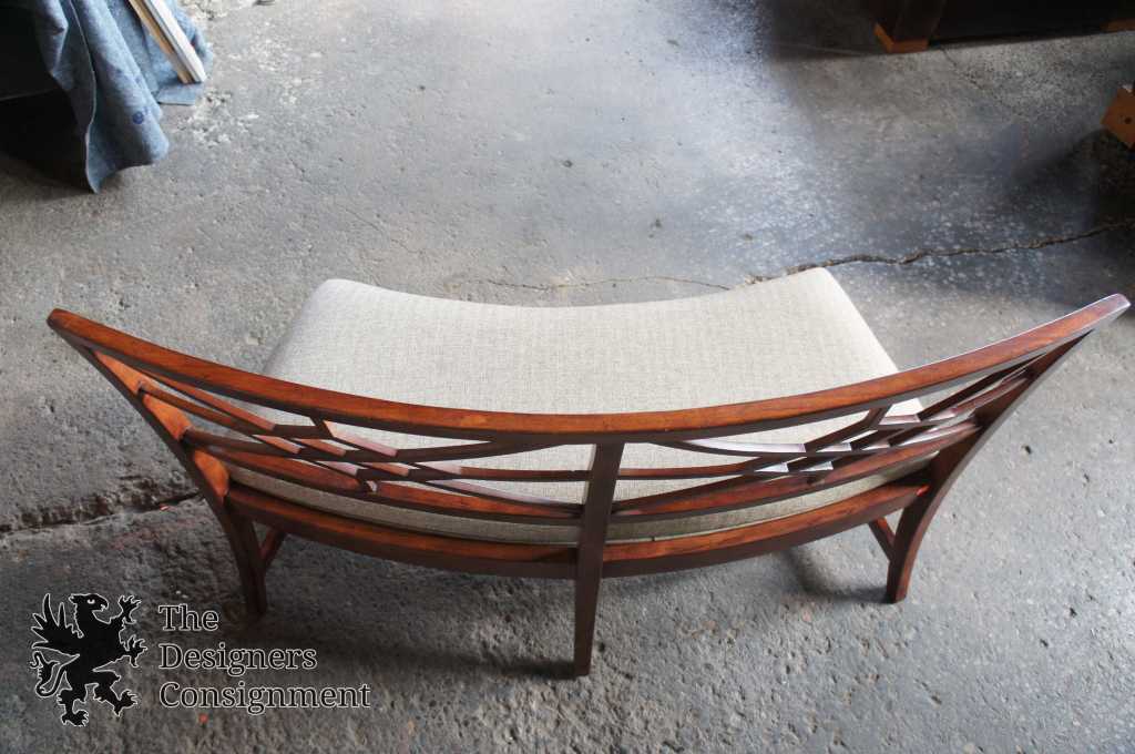 A beautiful curved bench seat by Universal Furniture. Perfect for dining or occasional use. Features a curved body with fretwork back and upholstered seat. Universal Furniture specializes in upholstery and has a showroom in North Carolina.