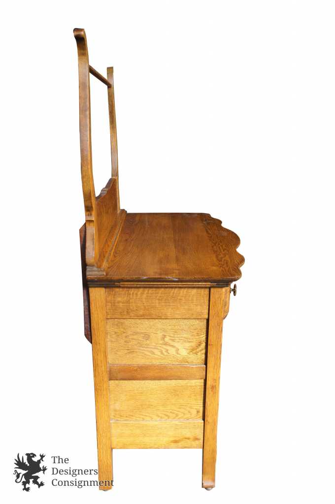 A beautiful golden oak washstand. Circa early 1900s. Features a serpentine front with one full drawer above 2 half drawers and lower cabinet portion. Original harp shaped towel bar is still in place. Drawers are mounted with brass hardware. Lower apron shows a scallop carved accents. A neat addition to any setting.