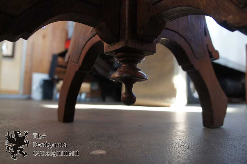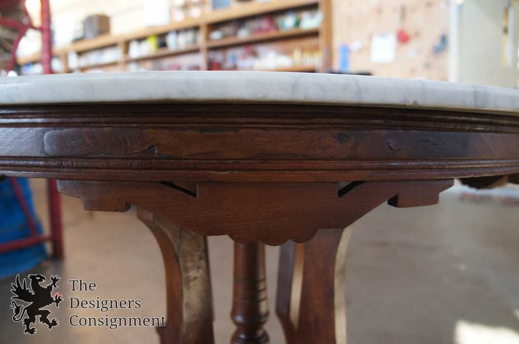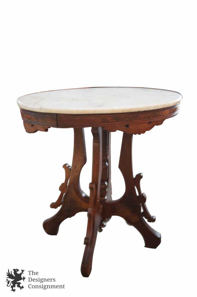 A beautifully designed Victorian Eastlake table. Made from Walnut with burlwood panels and a marble top. Each of the four legs show intricate detail with a central downward facing finial. The perfect addition to any setting