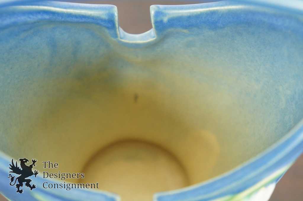 The exceptionally designed Roseville Pottery Freesia Blue basket. Circa 1940s.