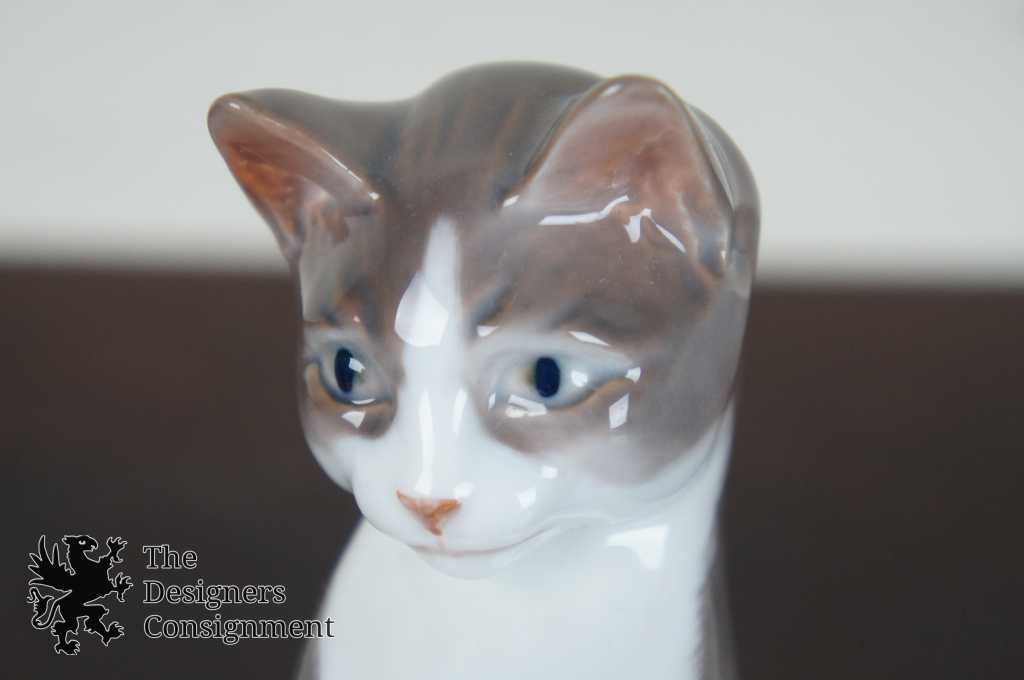 Bing Grondahl (B&G) Porcelain Cat Figurine. Grey & White, Seated. Made in Copenhagen, Denmark.