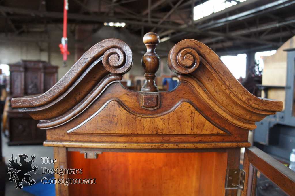 Up for consideration is a beautiful petite curio cabinet. Finished in walnut with distressed detail. A neat mix of traditional and Queen Anne Styling Circa 1950-1980s. Features upper and lower illuminated sections covered by bubble glass with adjustable interior shelving. The base shows bracketed feet opposite to the open pediment top with removable finial. Numbered 2740-729 along the back.