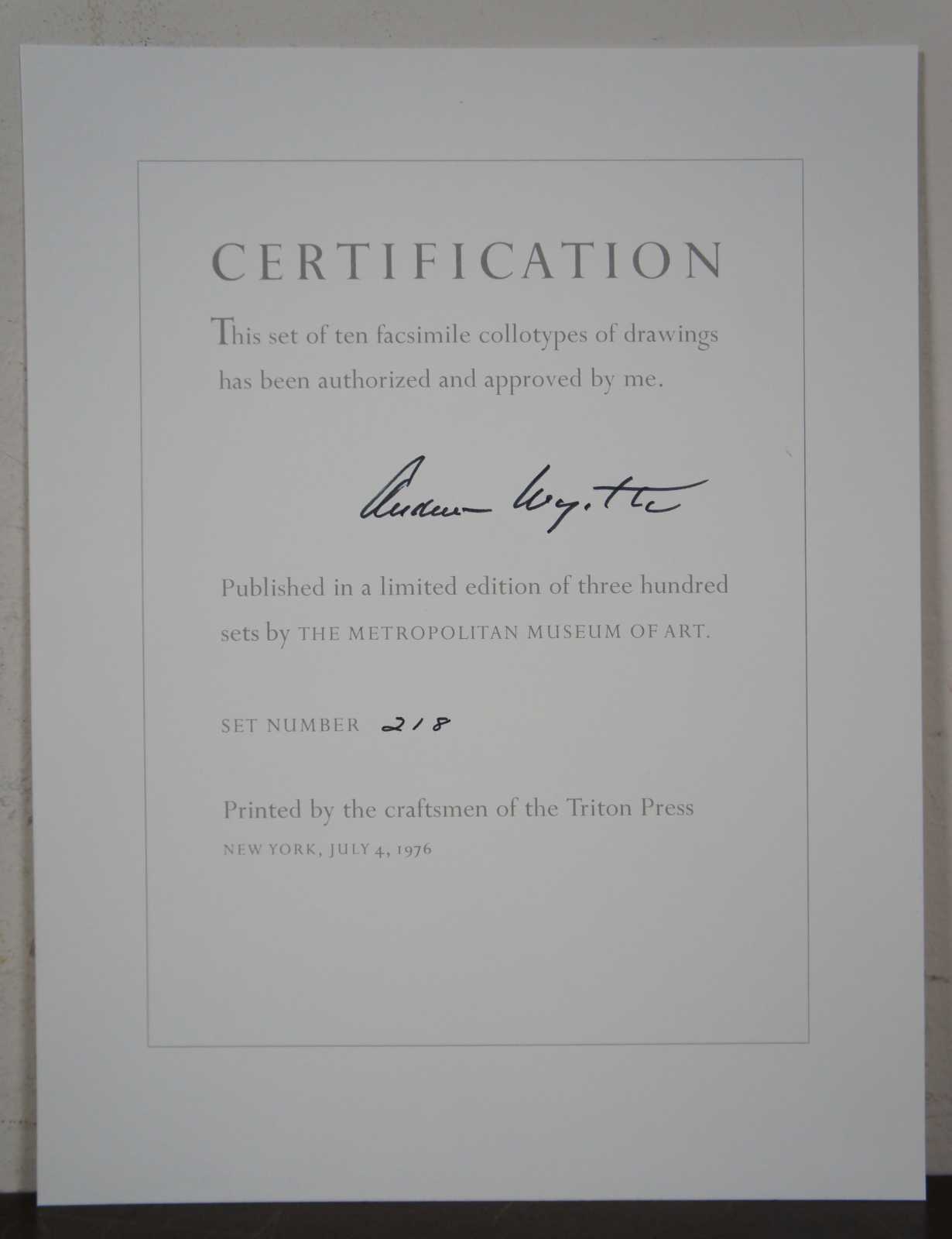The Kuerners – Study, 1971” by Andrew Wyeth. Professionally framed. From a portfolio of 10 facsimile collotype prints of drawings by Andrew Wyeth. Produced by The Metropolitan Museum of Art, 1976. The portfolio is certified and signed by Andrew Wyeth which was produced in a limited edition of three hundred sets. Photocopy of original certification included. This was set 218/300 printed by the craftsmen of the Triton Press New York, July 4th, 1976.