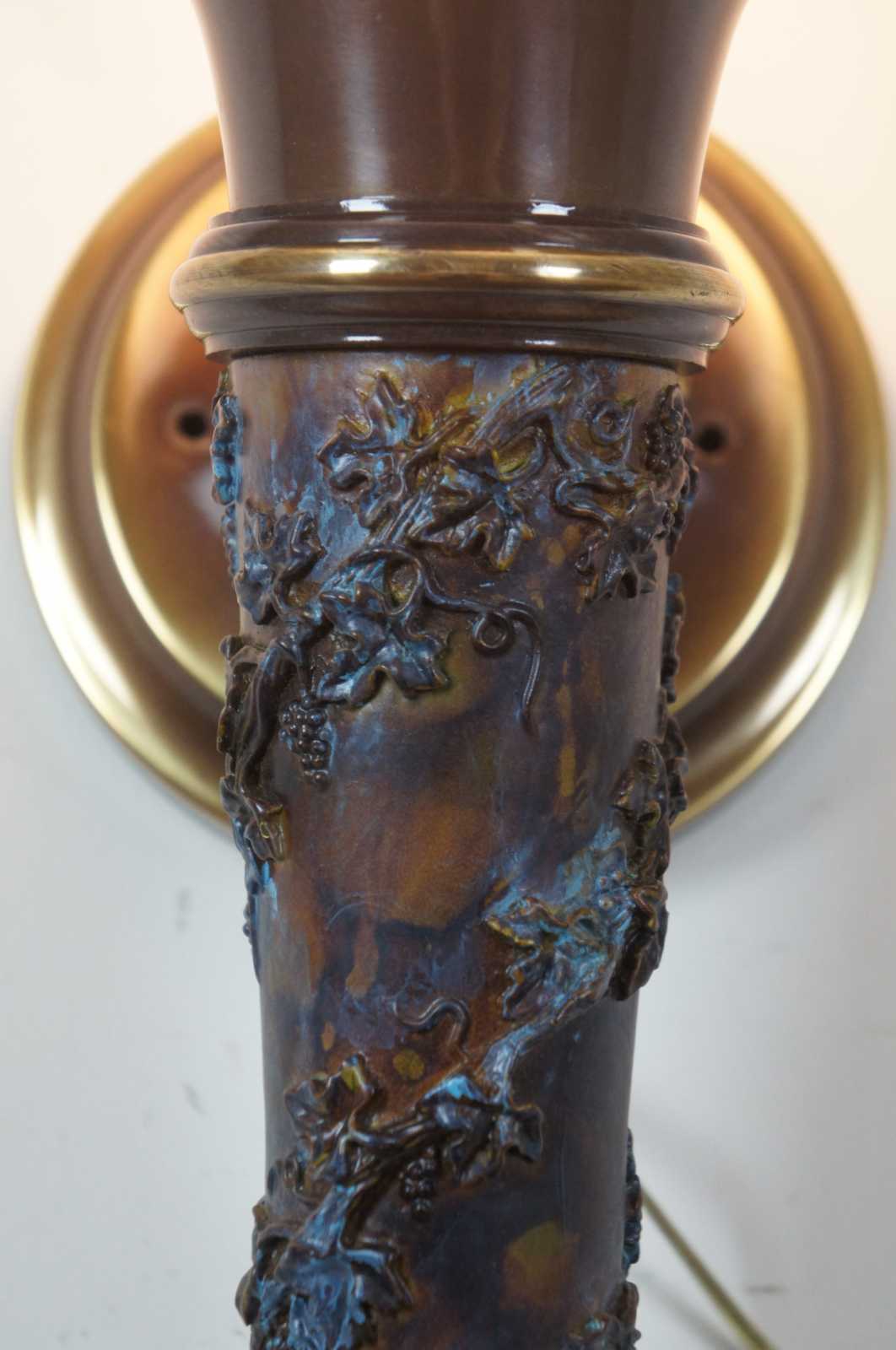 Two monumental French Empire style wall sconce torch lights with frosted glass shade. Made by Minka Lavery. Torch shaped with spiraling design. Made from metal with a brass finish and molded composition center. The lantern is set at any angle, and nicely weighted. The perfect compliment to any setting.